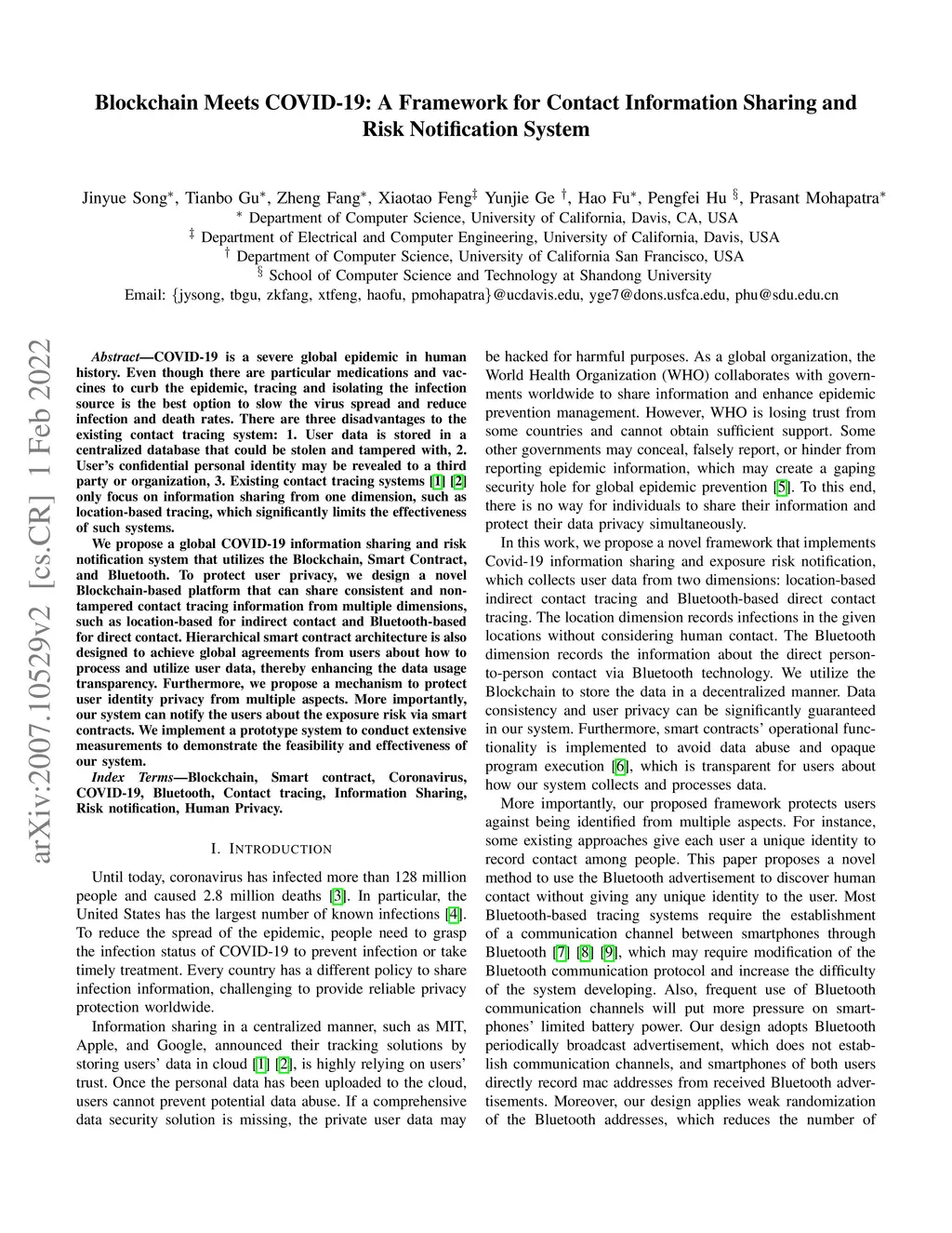 COVID-19 is a severe global epidemic in human history. Even though there are particular medications and vaccines to curb the epidemic, tracing and isolating the infection source is the best option to slow the virus spread and reduce infection and death rates. There are three disadvantages to the existing contact tracing system: 1. User data is stored in a centralized database that could be stolen and tampered with, 2. User's confidential personal identity may be revealed to a third party or organization, 3. Existing contact tracing systems only focus on information sharing from one dimension, such as location-based tracing, which significantly limits the effectiveness of such systems. We propose a global COVID-19 information sharing and risk notification system that utilizes the Blockchain, Smart Contract, and Bluetooth. To protect user privacy, we design a novel Blockchain-based platform that can share consistent and non-tampered contact tracing information from multiple dimensions, such as location-based for indirect contact and Bluetooth-based for direct contact. Hierarchical smart contract architecture is also designed to achieve global agreements from users about how to process and utilize user data, thereby enhancing the data usage transparency. Furthermore, we propose a mechanism to protect user identity privacy from multiple aspects. More importantly, our system can notify the users about the exposure risk via smart contracts. We implement a prototype system to conduct extensive measurements to demonstrate the feasibility and effectiveness of our system.