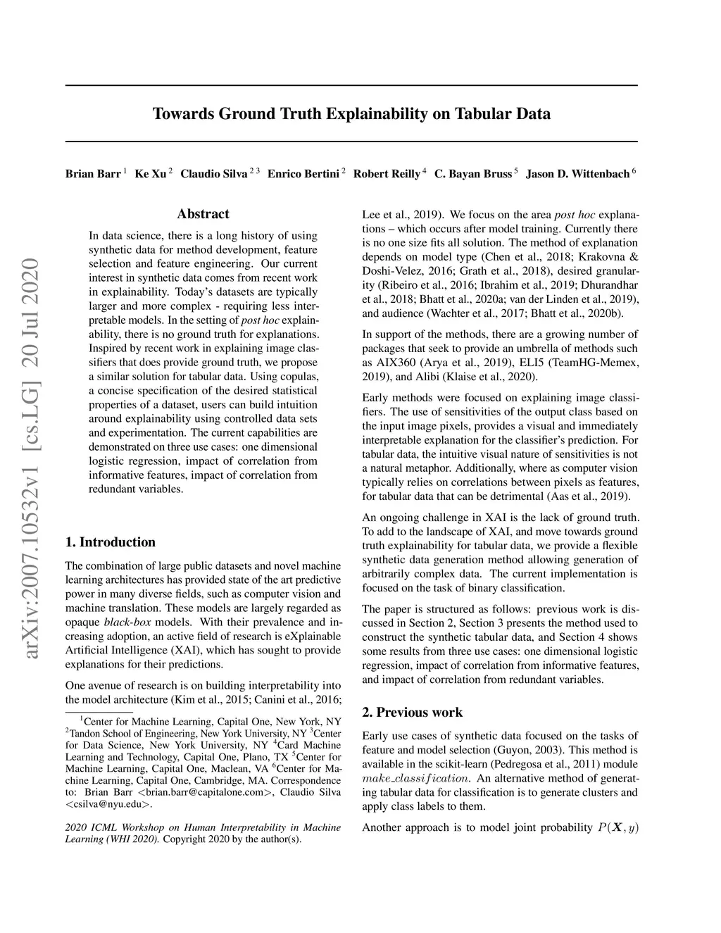 In data science, there is a long history of using synthetic data for method development, feature selection and feature engineering. Our current interest in synthetic data comes from recent work in explainability. Today's datasets are typically larger and more complex - requiring less interpretable models. In the setting of \textit{post hoc} explainability, there is no ground truth for explanations. Inspired by recent work in explaining image classifiers that does provide ground truth, we propose a similar solution for tabular data. Using copulas, a concise specification of the desired statistical properties of a dataset, users can build intuition around explainability using controlled data sets and experimentation. The current capabilities are demonstrated on three use cases: one dimensional logistic regression, impact of correlation from informative features, impact of correlation from redundant variables.