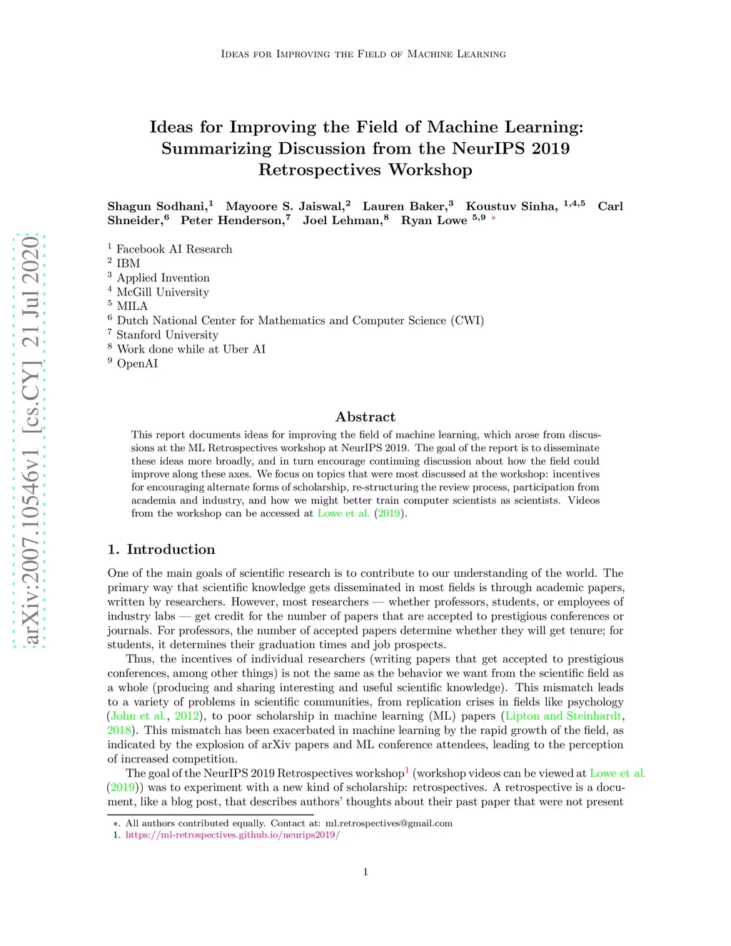 This report documents ideas for improving the field of machine learning, which arose from discussions at the ML Retrospectives workshop at NeurIPS 2019. The goal of the report is to disseminate these ideas more broadly, and in turn encourage continuing discussion about how the field could improve along these axes. We focus on topics that were most discussed at the workshop: incentives for encouraging alternate forms of scholarship, re-structuring the review process, participation from academia and industry, and how we might better train computer scientists as scientists. Videos from the workshop can be accessed at https://slideslive.com/neurips/west-114-115-retrospectives-a-venue-for-selfreflection-in-ml-research