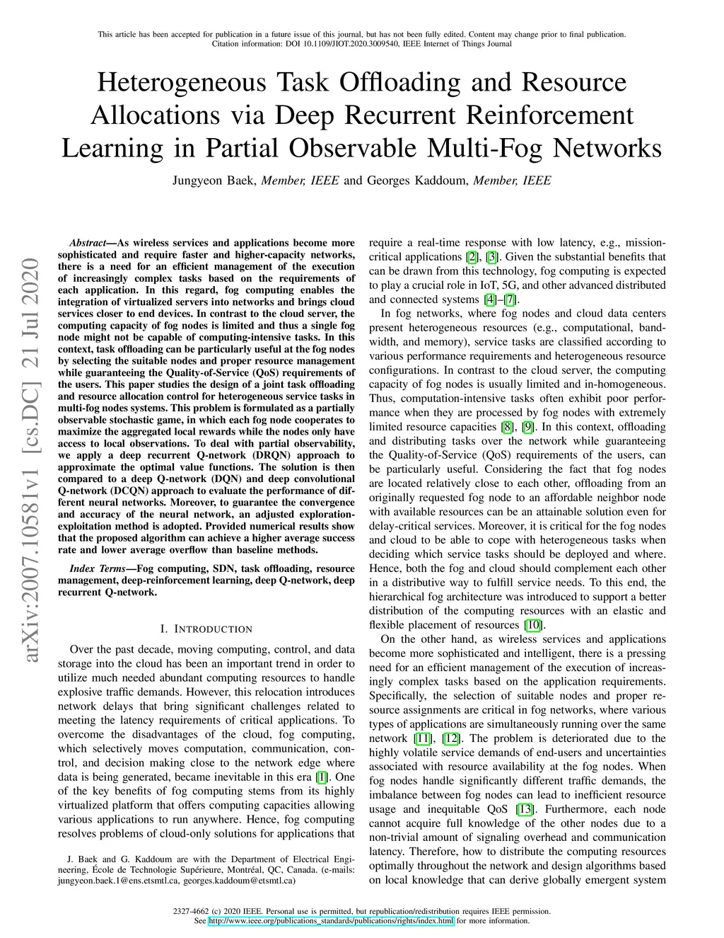 Recurrent Reinforcement Learning in Partial Observable Multi-Fog Networks