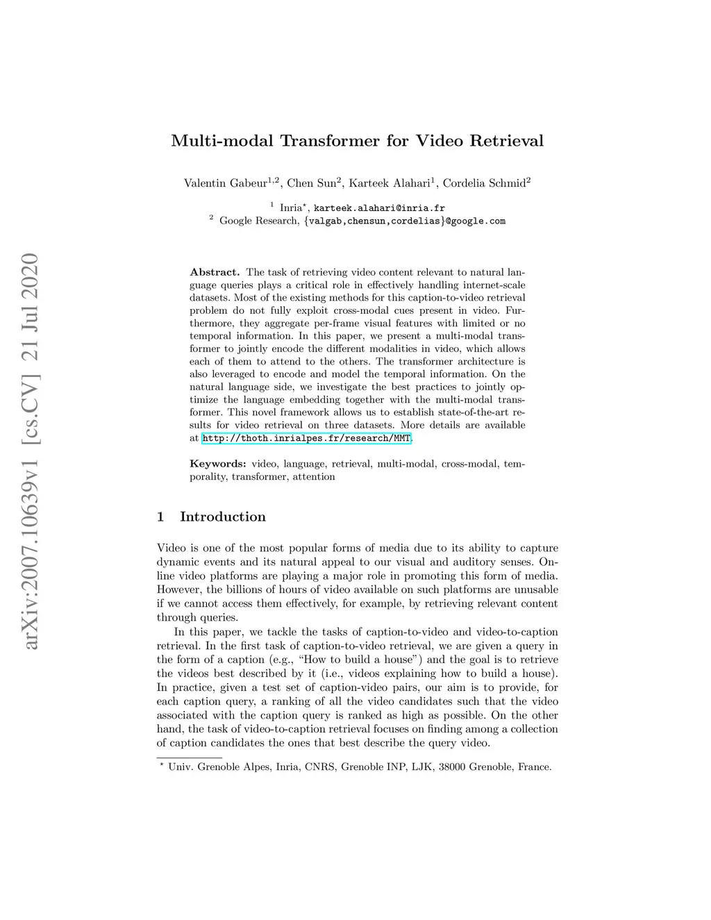 The task of retrieving video content relevant to natural language queries plays a critical role in effectively handling internet-scale datasets. Most of the existing methods for this caption-to-video retrieval problem do not fully exploit cross-modal cues present in video. Furthermore, they aggregate per-frame visual features with limited or no temporal information. In this paper, we present a multi-modal transformer to jointly encode the different modalities in video, which allows each of them to attend to the others. The transformer architecture is also leveraged to encode and model the temporal information. On the natural language side, we investigate the best practices to jointly optimize the language embedding together with the multi-modal transformer. This novel framework allows us to establish state-of-the-art results for video retrieval on three datasets. More details are available at http://thoth.inrialpes.fr/research/MMT.