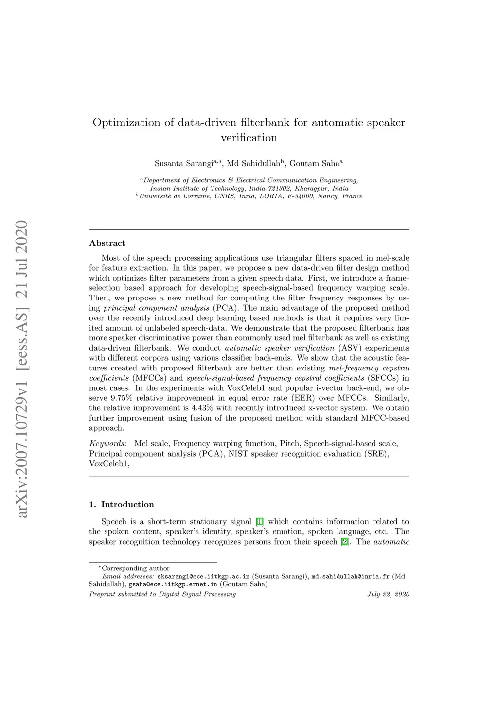 Most of the speech processing applications use triangular filters spaced in mel-scale for feature extraction. In this paper, we propose a new data-driven filter design method which optimizes filter parameters from a given speech data. First, we introduce a frame-selection based approach for developing speech-signal-based frequency warping scale. Then, we propose a new method for computing the filter frequency responses by using principal component analysis (PCA). The main advantage of the proposed method over the recently introduced deep learning based methods is that it requires very limited amount of unlabeled speech-data. We demonstrate that the proposed filterbank has more speaker discriminative power than commonly used mel filterbank as well as existing data-driven filterbank. We conduct automatic speaker verification (ASV) experiments with different corpora using various classifier back-ends. We show that the acoustic features created with proposed filterbank are better than existing mel-frequency cepstral coefficients (MFCCs) and speech-signal-based frequency cepstral coefficients (SFCCs) in most cases. In the experiments with VoxCeleb1 and popular i-vector back-end, we observe 9.75% relative improvement in equal error rate (EER) over MFCCs. Similarly, the relative improvement is 4.43% with recently introduced x-vector system. We obtain further improvement using fusion of the proposed method with standard MFCC-based approach.