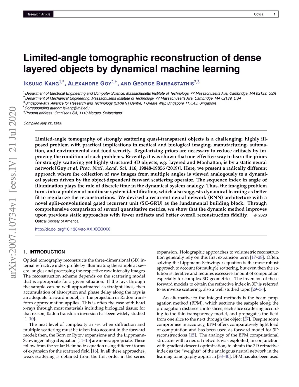 Limited-angle tomography of strongly scattering quasi-transparent objects is a challenging, highly ill-posed problem with practical implications in medical and biological imaging, manufacturing, automation, and environmental and food security. Regularizing priors are necessary to reduce artifacts by improving the condition of such problems. Recently, it was shown that one effective way to learn the priors for strongly scattering yet highly structured 3D objects, e.g. layered and Manhattan, is by a static neural network [Goy et al, Proc. Natl. Acad. Sci. 116, 19848-19856 (2019)]. Here, we present a radically different approach where the collection of raw images from multiple angles is viewed analogously to a dynamical system driven by the object-dependent forward scattering operator. The sequence index in angle of illumination plays the role of discrete time in the dynamical system analogy. Thus, the imaging problem turns into a problem of nonlinear system identification, which also suggests dynamical learning as better fit to regularize the reconstructions. We devised a recurrent neural network (RNN) architecture with a novel split-convolutional gated recurrent unit (SC-GRU) as the fundamental building block. Through comprehensive comparison of several quantitative metrics, we show that the dynamic method improves upon previous static approaches with fewer artifacts and better overall reconstruction fidelity.