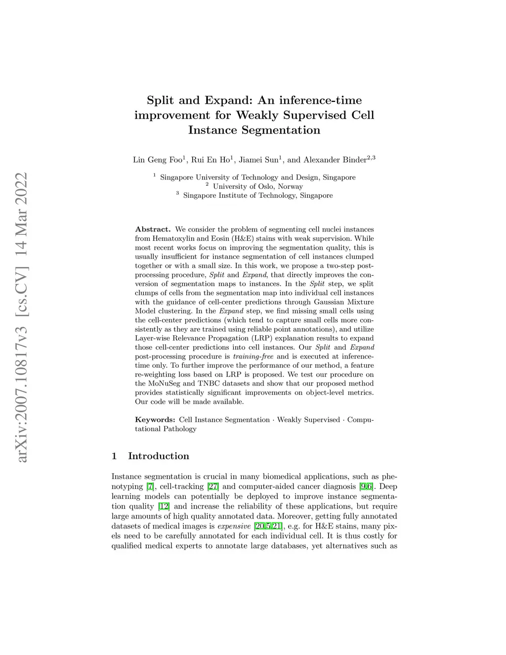 We consider the problem of segmenting cell nuclei instances from Hematoxylin and Eosin (H&E) stains with weak supervision. While most recent works focus on improving the segmentation quality, this is usually insufficient for instance segmentation of cell instances clumped together or with a small size. In this work, we propose a two-step post-processing procedure, Split and Expand, that directly improves the conversion of segmentation maps to instances. In the Split step, we split clumps of cells from the segmentation map into individual cell instances with the guidance of cell-center predictions through Gaussian Mixture Model clustering. In the Expand step, we find missing small cells using the cell-center predictions (which tend to capture small cells more consistently as they are trained using reliable point annotations), and utilize Layer-wise Relevance Propagation (LRP) explanation results to expand those cell-center predictions into cell instances. Our Split and Expand post-processing procedure is training-free and is executed at inference-time only. To further improve the performance of our method, a feature re-weighting loss based on LRP is proposed. We test our procedure on the MoNuSeg and TNBC datasets and show that our proposed method provides statistically significant improvements on object-level metrics. Our code will be made available.