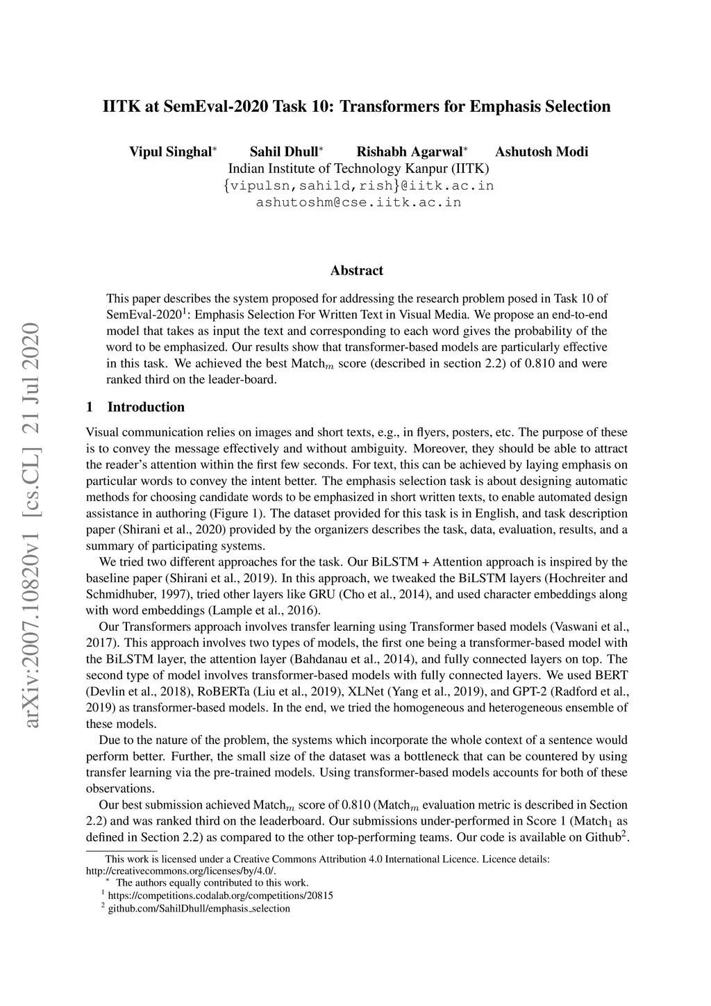 This paper describes the system proposed for addressing the research problem posed in Task 10 of SemEval-2020: Emphasis Selection For Written Text in Visual Media. We propose an end-to-end model that takes as input the text and corresponding to each word gives the probability of the word to be emphasized. Our results show that transformer-based models are particularly effective in this task. We achieved the best Matchm score (described in section 2.2) of 0.810 and were ranked third on the leaderboard.
