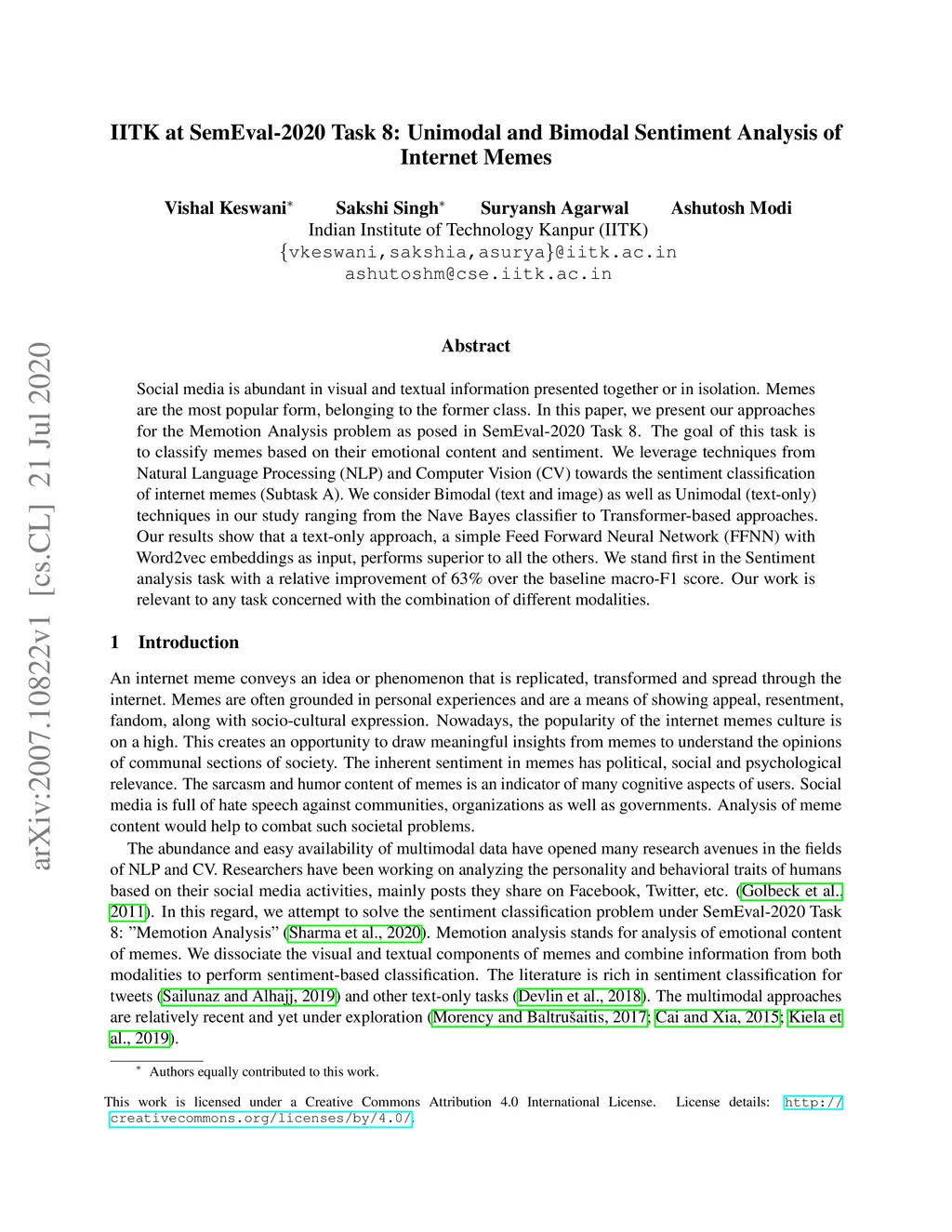 IITK at SemEval-2020 Task 8: Unimodal and Bimodal Sentiment Analysis of