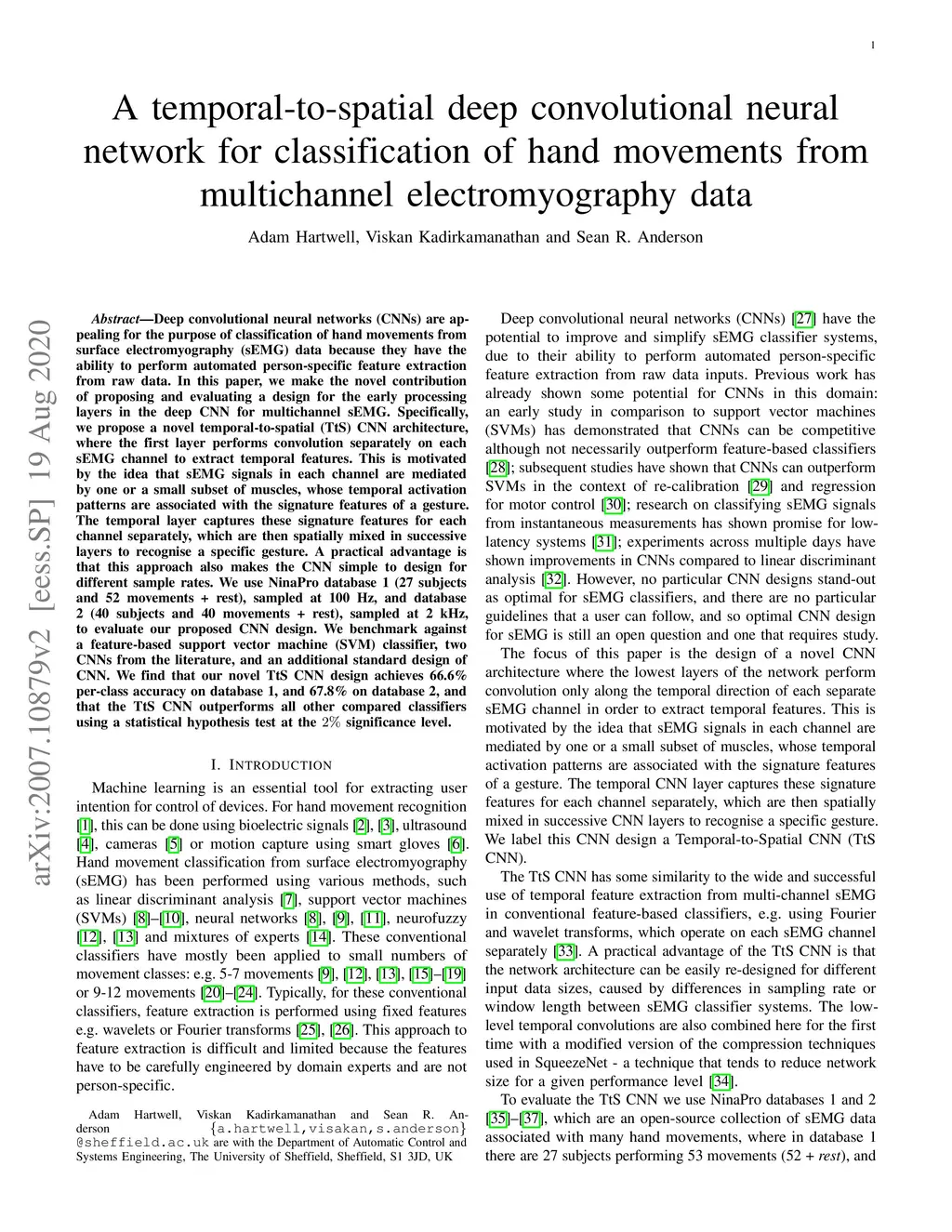 Deep convolutional neural networks (CNNs) are appealing for the purpose of classification of hand movements from surface electromyography (sEMG) data because they have the ability to perform automated person-specific feature extraction from raw data. In this paper, we make the novel contribution of proposing and evaluating a design for the early processing layers in the deep CNN for multichannel sEMG. Specifically, we propose a novel temporal-to-spatial (TtS) CNN architecture, where the first layer performs convolution separately on each sEMG channel to extract temporal features. This is motivated by the idea that sEMG signals in each channel are mediated by one or a small subset of muscles, whose temporal activation patterns are associated with the signature features of a gesture. The temporal layer captures these signature features for each channel separately, which are then spatially mixed in successive layers to recognise a specific gesture. A practical advantage is that this approach also makes the CNN simple to design for different sample rates. We use NinaPro database 1 (27 subjects and 52 movements + rest), sampled at 100 Hz, and database 2 (40 subjects and 40 movements + rest), sampled at 2 kHz, to evaluate our proposed CNN design. We benchmark against a feature-based support vector machine (SVM) classifier, two CNNs from the literature, and an additional standard design of CNN. We find that our novel TtS CNN design achieves 66.6% per-class accuracy on database 1, and 67.8% on database 2, and that the TtS CNN outperforms all other compared classifiers using a statistical hypothesis test at the 2% significance level.