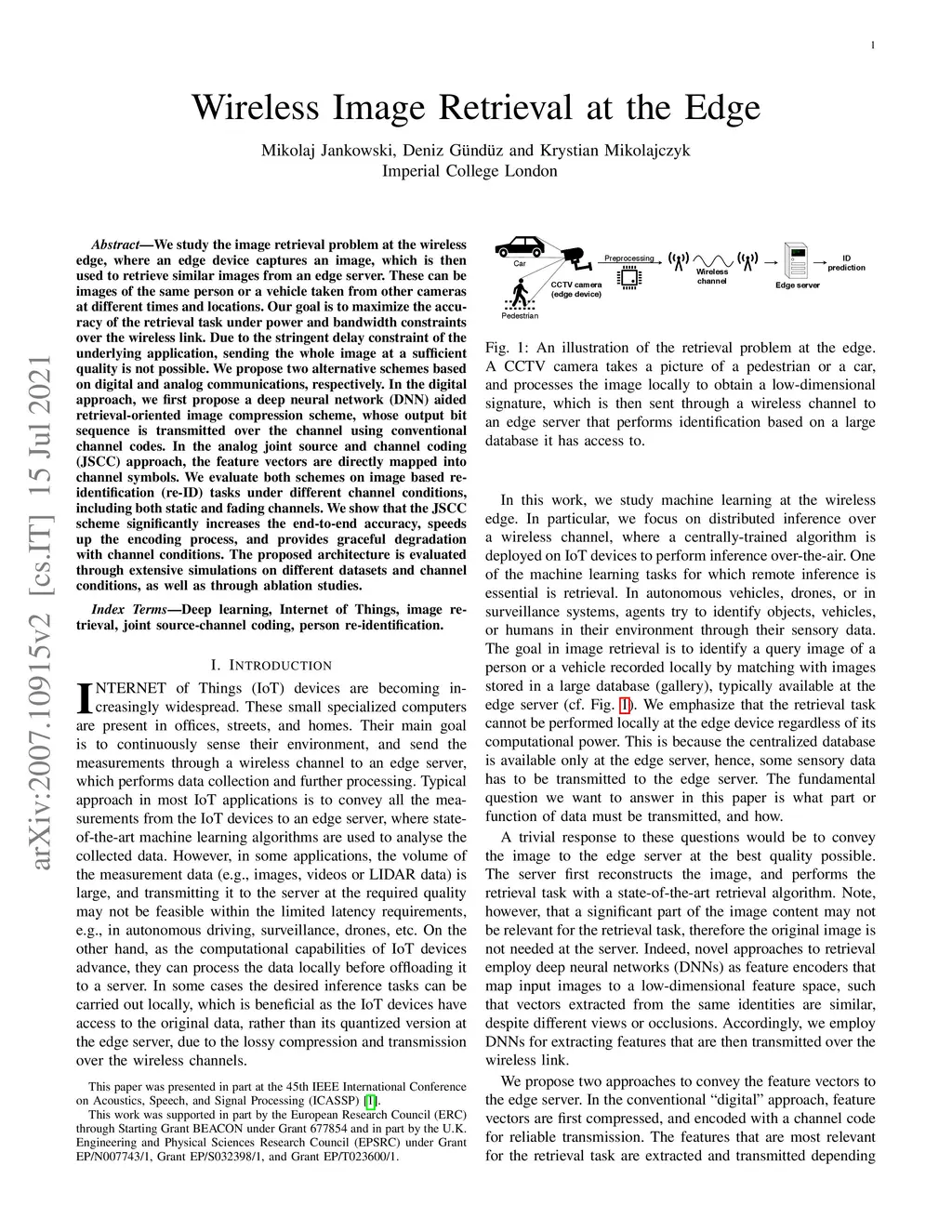 We study the image retrieval problem at the wireless edge, where an edge device captures an image, which is then used to retrieve similar images from an edge server. These can be images of the same person or a vehicle taken from other cameras at different times and locations. Our goal is to maximize the accuracy of the retrieval task under power and bandwidth constraints over the wireless link. Due to the stringent delay constraint of the underlying application, sending the whole image at a sufficient quality is not possible. We propose two alternative schemes based on digital and analog communications, respectively. In the digital approach, we first propose a deep neural network (DNN) aided retrieval-oriented image compression scheme, whose output bit sequence is transmitted over the channel using conventional channel codes. In the analog joint source and channel coding (JSCC) approach, the feature vectors are directly mapped into channel symbols. We evaluate both schemes on image based re-identification (re-ID) tasks under different channel conditions, including both static and fading channels. We show that the JSCC scheme significantly increases the end-to-end accuracy, speeds up the encoding process, and provides graceful degradation with channel conditions. The proposed architecture is evaluated through extensive simulations on different datasets and channel conditions, as well as through ablation studies.