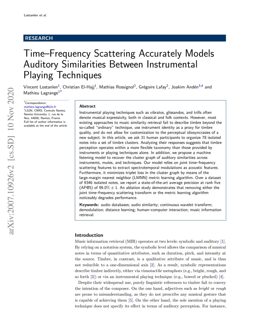 Instrumental playing techniques such as vibratos, glissandos, and trills often denote musical expressivity, both in classical and folk contexts. However, most existing approaches to music similarity retrieval fail to describe timbre beyond the so-called "ordinary" technique, use instrument identity as a proxy for timbre quality, and do not allow for customization to the perceptual idiosyncrasies of a new subject. In this article, we ask 31 human subjects to organize 78 isolated notes into a set of timbre clusters. Analyzing their responses suggests that timbre perception operates within a more flexible taxonomy than those provided by instruments or playing techniques alone. In addition, we propose a machine listening model to recover the cluster graph of auditory similarities across instruments, mutes, and techniques. Our model relies on joint time--frequency scattering features to extract spectrotemporal modulations as acoustic features. Furthermore, it minimizes triplet loss in the cluster graph by means of the large-margin nearest neighbor (LMNN) metric learning algorithm. Over a dataset of 9346 isolated notes, we report a state-of-the-art average precision at rank five (AP@5) of . An ablation study demonstrates that removing either the joint time--frequency scattering transform or the metric learning algorithm noticeably degrades performance.