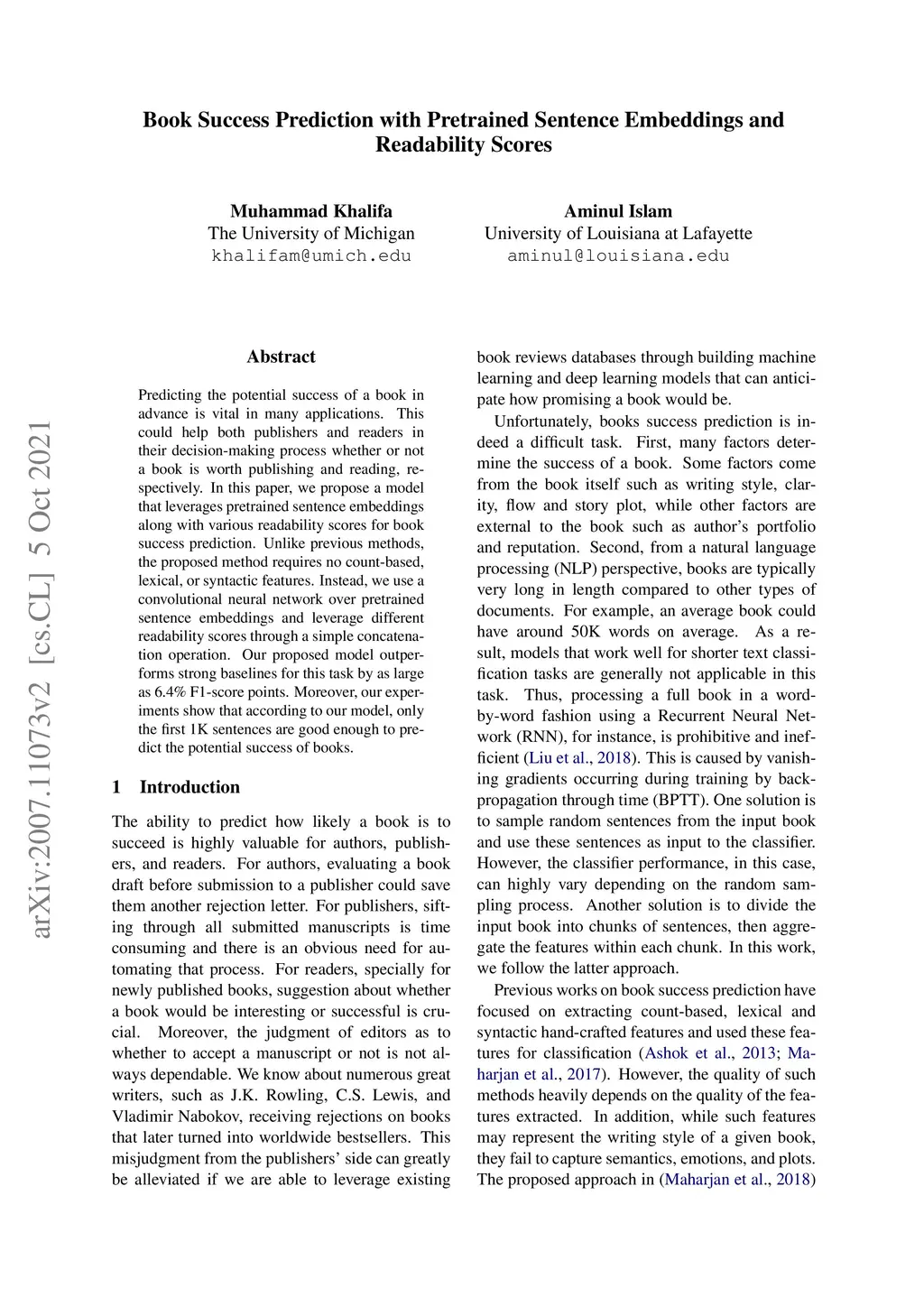 Predicting the potential success of a book in advance is vital in many applications. This could help both publishers and readers in their decision-making process whether or not a book is worth publishing and reading, respectively. In this paper, we propose a model that leverages pretrained sentence embeddings along with various readability scores for book success prediction. Unlike previous methods, the proposed method requires no count-based, lexical, or syntactic features. Instead, we use a convolutional neural network over pretrained sentence embeddings and leverage different readability scores through a simple concatenation operation. Our proposed model outperforms strong baselines for this task by as large as 6.4\% F1-score points. Moreover, our experiments show that according to our model, only the first 1K sentences are good enough to predict the potential success of books.