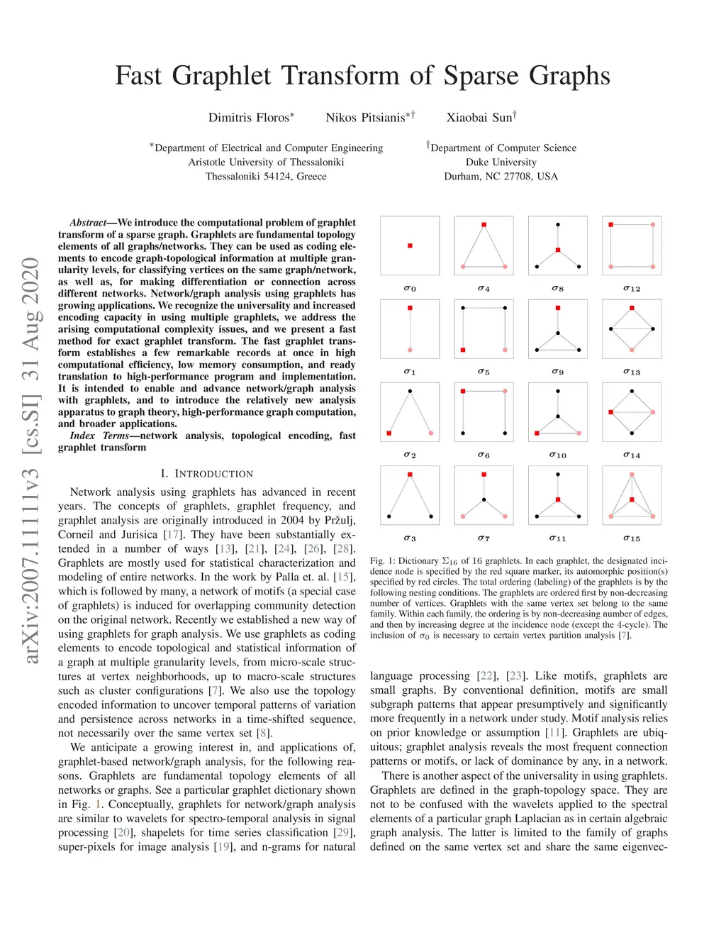 We introduce the computational problem of graphlet transform of a sparse large graph. Graphlets are fundamental topology elements of all graphs/networks. They can be used as coding elements to encode graph-topological information at multiple granularity levels for classifying vertices on the same graph/network as well as for making differentiation or connection across different networks. Network/graph analysis using graphlets has growing applications. We recognize the universality and increased encoding capacity in using multiple graphlets, we address the arising computational complexity issues, and we present a fast method for exact graphlet transform. The fast graphlet transform establishes a few remarkable records at once in high computational efficiency, low memory consumption, and ready translation to high-performance program and implementation. It is intended to enable and advance network/graph analysis with graphlets, and to introduce the relatively new analysis apparatus to graph theory, high-performance graph computation, and broader applications.