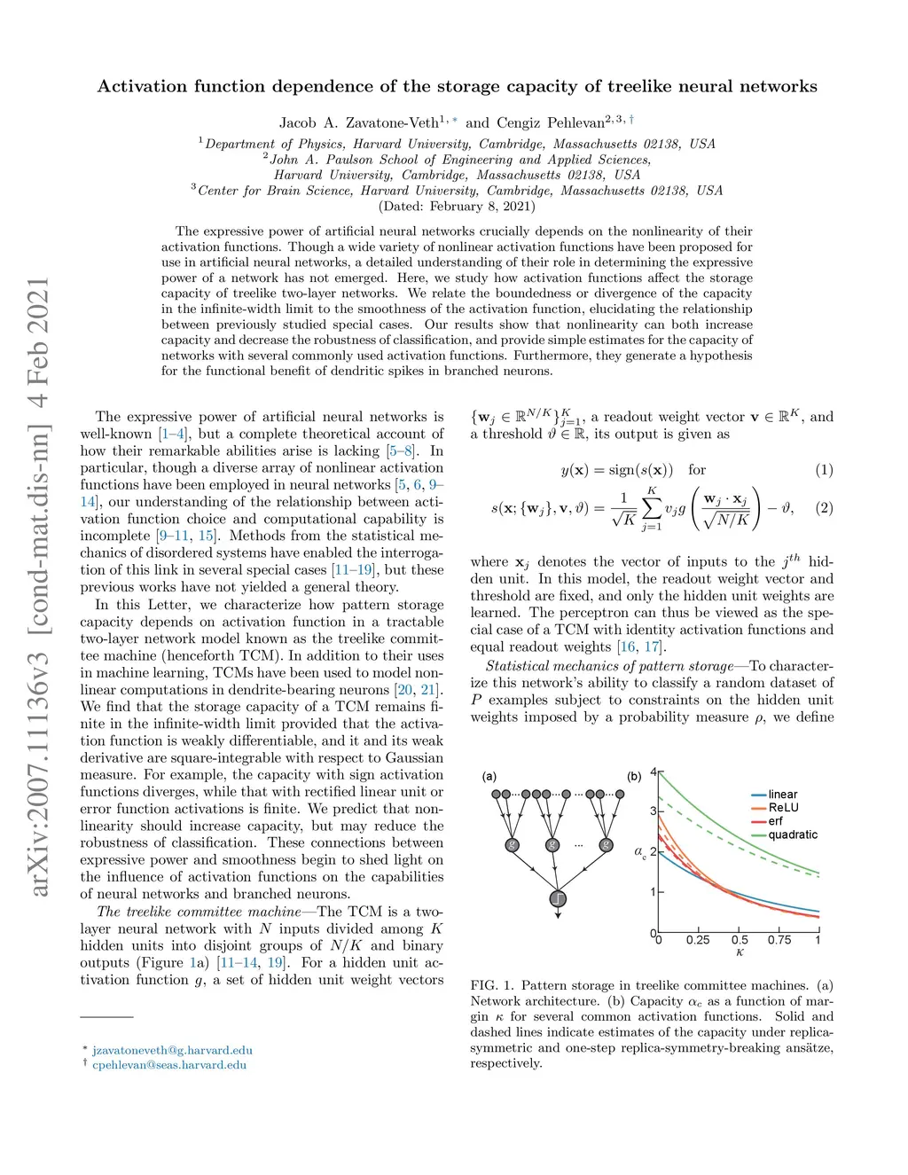The expressive power of artificial neural networks crucially depends on the nonlinearity of their activation functions. Though a wide variety of nonlinear activation functions have been proposed for use in artificial neural networks, a detailed understanding of their role in determining the expressive power of a network has not emerged. Here, we study how activation functions affect the storage capacity of treelike two-layer networks. We relate the boundedness or divergence of the capacity in the infinite-width limit to the smoothness of the activation function, elucidating the relationship between previously studied special cases. Our results show that nonlinearity can both increase capacity and decrease the robustness of classification, and provide simple estimates for the capacity of networks with several commonly used activation functions. Furthermore, they generate a hypothesis for the functional benefit of dendritic spikes in branched neurons.