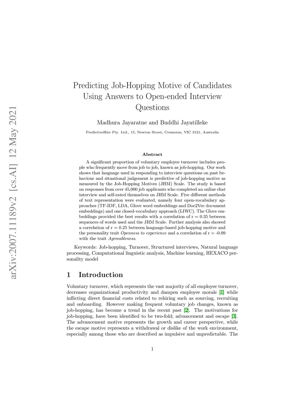 Predicting Job-Hopping Motive of Candidates Using Answers to Open-ended