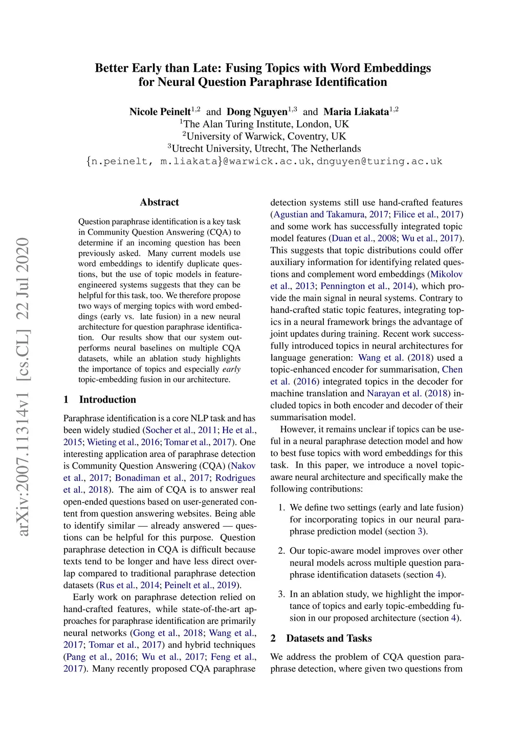 Question paraphrase identification is a key task in Community Question Answering (CQA) to determine if an incoming question has been previously asked. Many current models use word embeddings to identify duplicate questions, but the use of topic models in feature-engineered systems suggests that they can be helpful for this task, too. We therefore propose two ways of merging topics with word embeddings (early vs. late fusion) in a new neural architecture for question paraphrase identification. Our results show that our system outperforms neural baselines on multiple CQA datasets, while an ablation study highlights the importance of topics and especially early topic-embedding fusion in our architecture.