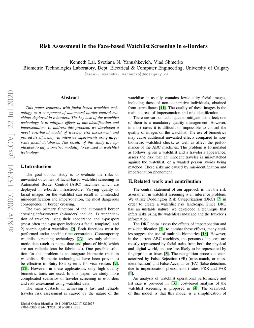 This paper concerns with facial-based watchlist technology as a component of automated border control machines deployed in e-borders. The key task of the watchlist technology is to mitigate effects of mis-identification and impersonation. To address this problem, we developed a novel cost-based model of traveler risk assessment and proved its efficiency via intensive experiments using large-scale facial databases. The results of this study are applicable to any biometric modality to be used in watchlist technology.