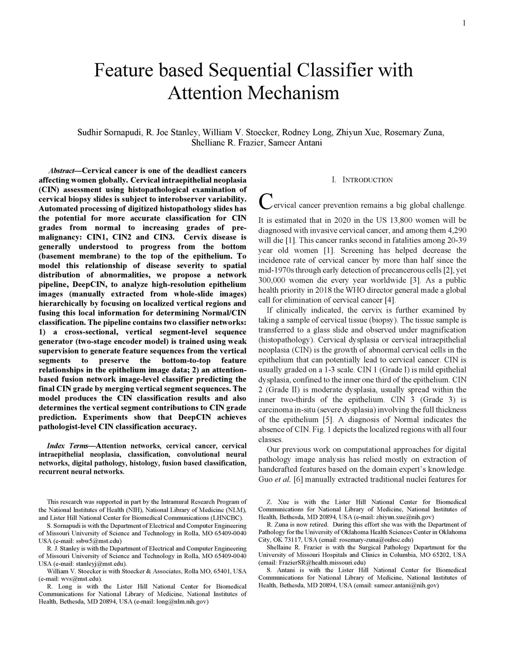 Cervical cancer is one of the deadliest cancers affecting women globally. Cervical intraepithelial neoplasia (CIN) assessment using histopathological examination of cervical biopsy slides is subject to interobserver variability. Automated processing of digitized histopathology slides has the potential for more accurate classification for CIN grades from normal to increasing grades of pre-malignancy: CIN1, CIN2 and CIN3. Cervix disease is generally understood to progress from the bottom (basement membrane) to the top of the epithelium. To model this relationship of disease severity to spatial distribution of abnormalities, we propose a network pipeline, DeepCIN, to analyze high-resolution epithelium images (manually extracted from whole-slide images) hierarchically by focusing on localized vertical regions and fusing this local information for determining Normal/CIN classification. The pipeline contains two classifier networks: 1) a cross-sectional, vertical segment-level sequence generator (two-stage encoder model) is trained using weak supervision to generate feature sequences from the vertical segments to preserve the bottom-to-top feature relationships in the epithelium image data; 2) an attention-based fusion network image-level classifier predicting the final CIN grade by merging vertical segment sequences. The model produces the CIN classification results and also determines the vertical segment contributions to CIN grade prediction. Experiments show that DeepCIN achieves pathologist-level CIN classification accuracy.