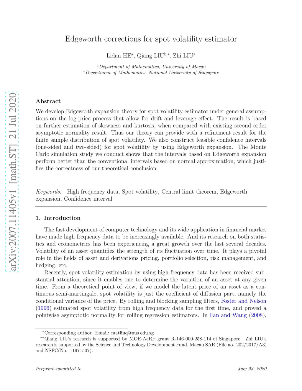 We develop Edgeworth expansion theory for spot volatility estimator under general assumptions on the log-price process that allow for drift and leverage effect. The result is based on further estimation of skewness and kurtosis, when compared with existing second order asymptotic normality result. Thus our theory can provide with a refinement result for the finite sample distribution of spot volatility. We also construct feasible confidence intervals (one-sided and two-sided) for spot volatility by using Edgeworth expansion. The Monte Carlo simulation study we conduct shows that the intervals based on Edgeworth expansion perform better than the conventional intervals based on normal approximation, which justifies the correctness of our theoretical conclusion.