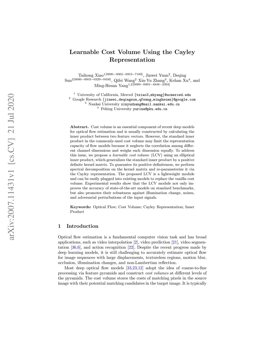 Cost volume is an essential component of recent deep models for optical flow estimation and is usually constructed by calculating the inner product between two feature vectors. However, the standard inner product in the commonly-used cost volume may limit the representation capacity of flow models because it neglects the correlation among different channel dimensions and weighs each dimension equally. To address this issue, we propose a learnable cost volume (LCV) using an elliptical inner product, which generalizes the standard inner product by a positive definite kernel matrix. To guarantee its positive definiteness, we perform spectral decomposition on the kernel matrix and re-parameterize it via the Cayley representation. The proposed LCV is a lightweight module and can be easily plugged into existing models to replace the vanilla cost volume. Experimental results show that the LCV module not only improves the accuracy of state-of-the-art models on standard benchmarks, but also promotes their robustness against illumination change, noises, and adversarial perturbations of the input signals.