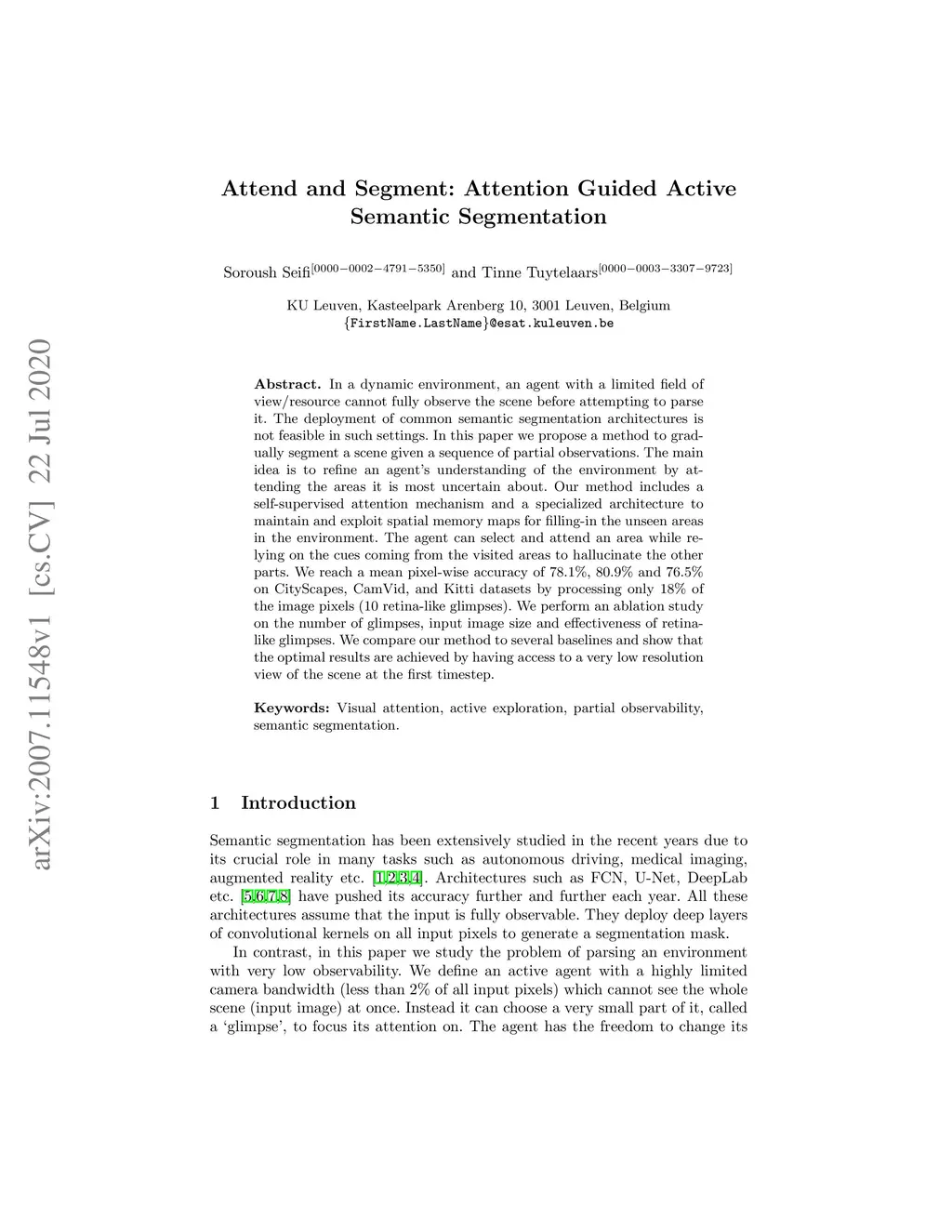 In a dynamic environment, an agent with a limited field of view/resource cannot fully observe the scene before attempting to parse it. The deployment of common semantic segmentation architectures is not feasible in such settings. In this paper we propose a method to gradually segment a scene given a sequence of partial observations. The main idea is to refine an agent's understanding of the environment by attending the areas it is most uncertain about. Our method includes a self-supervised attention mechanism and a specialized architecture to maintain and exploit spatial memory maps for filling-in the unseen areas in the environment. The agent can select and attend an area while relying on the cues coming from the visited areas to hallucinate the other parts. We reach a mean pixel-wise accuracy of 78.1%, 80.9% and 76.5% on CityScapes, CamVid, and Kitti datasets by processing only 18% of the image pixels (10 retina-like glimpses). We perform an ablation study on the number of glimpses, input image size and effectiveness of retina-like glimpses. We compare our method to several baselines and show that the optimal results are achieved by having access to a very low resolution view of the scene at the first timestep.
