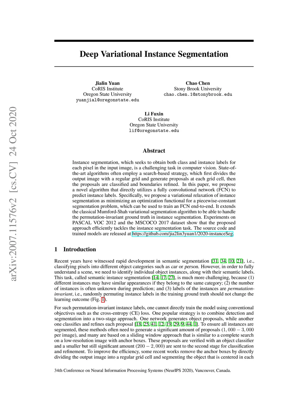 Instance Segmentation, which seeks to obtain both class and instance labels for each pixel in the input image, is a challenging task in computer vision. State-of-the-art algorithms often employ two separate stages, the first one generating object proposals and the second one recognizing and refining the boundaries. Further, proposals are usually based on detectors such as faster R-CNN which search for boxes in the entire image exhaustively. In this paper, we propose a novel algorithm that directly utilizes a fully convolutional network (FCN) to predict instance labels. Specifically, we propose a variational relaxation of instance segmentation as minimizing an optimization functional for a piecewise-constant segmentation problem, which can be used to train an FCN end-to-end. It extends the classical Mumford-Shah variational segmentation problem to be able to handle permutation-invariant labels in the ground truth of instance segmentation. Experiments on PASCAL VOC 2012, Semantic Boundaries dataset(SBD), and the MSCOCO 2017 dataset show that the proposed approach efficiently tackle the instance segmentation task. The source code and trained models will be released with the paper.