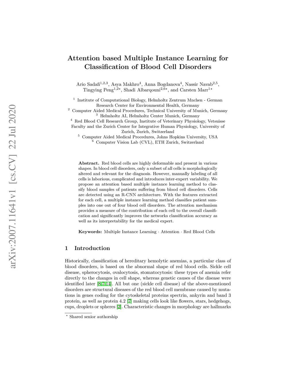 Red blood cells are highly deformable and present in various shapes. In blood cell disorders, only a subset of all cells is morphologically altered and relevant for the diagnosis. However, manually labeling of all cells is laborious, complicated and introduces inter-expert variability. We propose an attention based multiple instance learning method to classify blood samples of patients suffering from blood cell disorders. Cells are detected using an R-CNN architecture. With the features extracted for each cell, a multiple instance learning method classifies patient samples into one out of four blood cell disorders. The attention mechanism provides a measure of the contribution of each cell to the overall classification and significantly improves the network's classification accuracy as well as its interpretability for the medical expert.