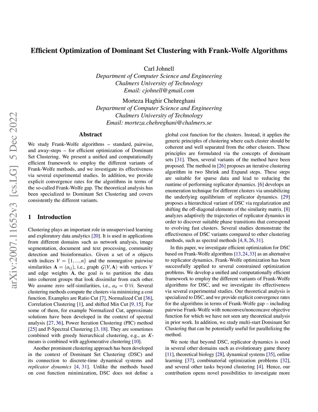 We study Frank-Wolfe algorithms - standard, pairwise, and away-steps - for efficient optimization of Dominant Set Clustering. We present a unified and computationally efficient framework to employ the different variants of Frank-Wolfe methods, and we investigate its effectiveness via several experimental studies. In addition, we provide explicit convergence rates for the algorithms in terms of the so-called Frank-Wolfe gap. The theoretical analysis has been specialized to Dominant Set Clustering and covers consistently the different variants.