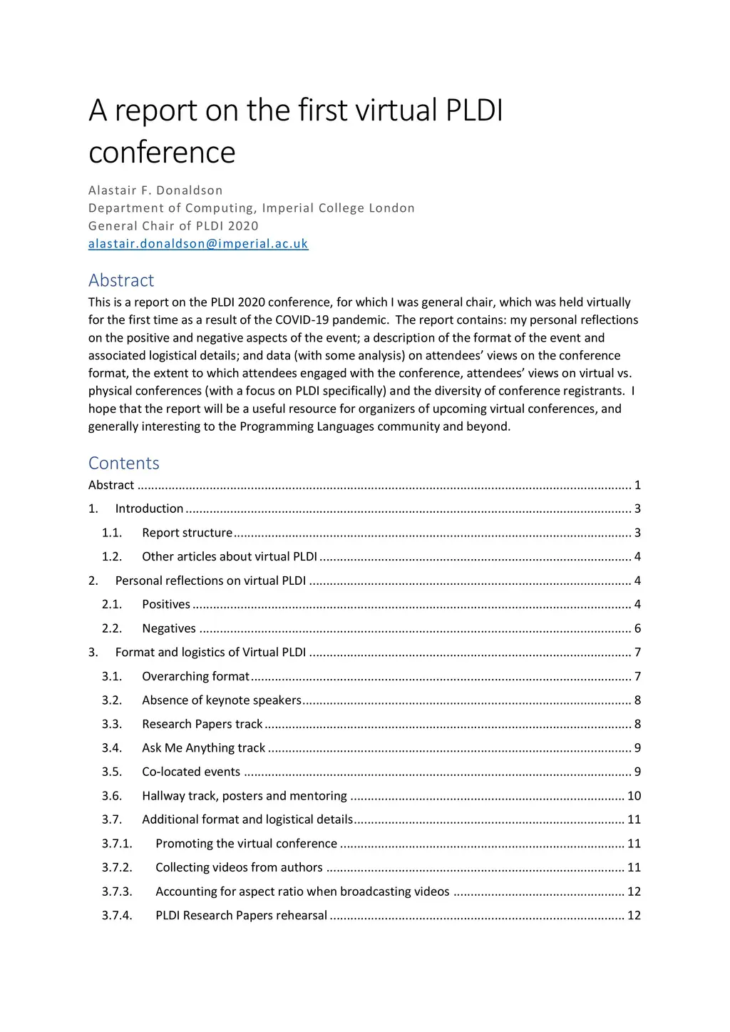 This is a report on the PLDI 2020 conference, for which I was General Chair, which was held virtually for the first time as a result of the COVID-19 pandemic. The report contains: my personal reflections on the positive and negative aspects of the event; a description of the format of the event and associated logistical details; and data (with some analysis) on attendees' views on the conference format, the extent to which attendees engaged with the conference, attendees' views on virtual vs. physical conferences (with a focus on PLDI specifically) and the diversity of conference registrants. I hope that the report will be a useful resource for organizers of upcoming virtual conferences, and generally interesting to the Programming Languages community and beyond.