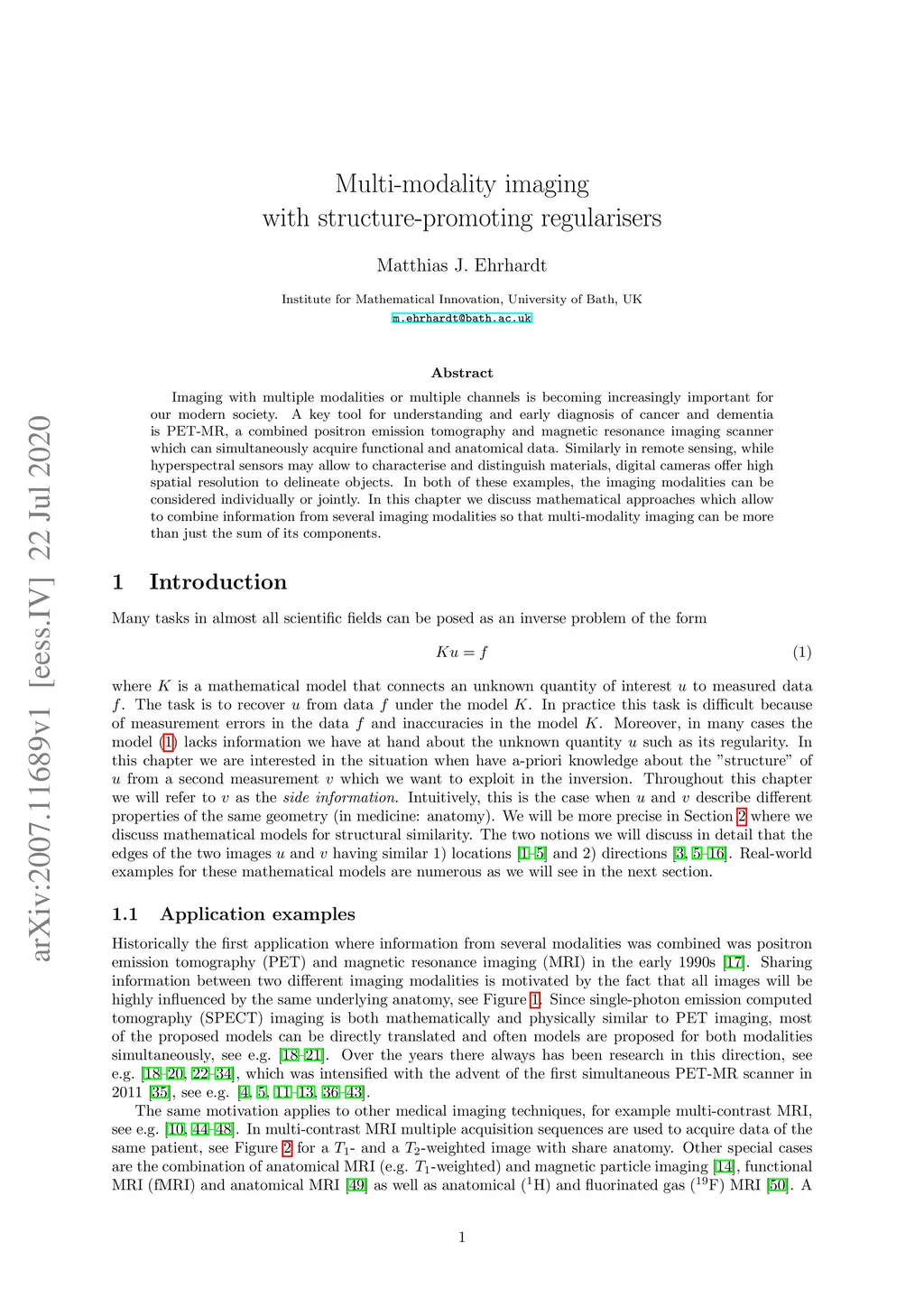 Imaging with multiple modalities or multiple channels is becoming increasingly important for our modern society. A key tool for understanding and early diagnosis of cancer and dementia is PET-MR, a combined positron emission tomography and magnetic resonance imaging scanner which can simultaneously acquire functional and anatomical data. Similarly in remote sensing, while hyperspectral sensors may allow to characterise and distinguish materials, digital cameras offer high spatial resolution to delineate objects. In both of these examples, the imaging modalities can be considered individually or jointly. In this chapter we discuss mathematical approaches which allow to combine information from several imaging modalities so that multi-modality imaging can be more than just the sum of its components.