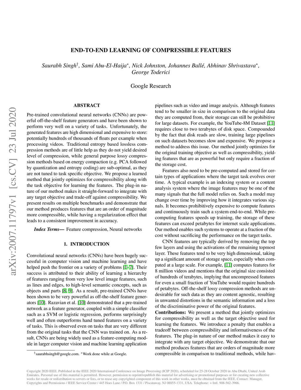 Pre-trained convolutional neural networks (CNNs) are powerful off-the-shelf feature generators and have been shown to perform very well on a variety of tasks. Unfortunately, the generated features are high dimensional and expensive to store: potentially hundreds of thousands of floats per example when processing videos. Traditional entropy based lossless compression methods are of little help as they do not yield desired level of compression, while general purpose lossy compression methods based on energy compaction (e.g. PCA followed by quantization and entropy coding) are sub-optimal, as they are not tuned to task specific objective. We propose a learned method that jointly optimizes for compressibility along with the task objective for learning the features. The plug-in nature of our method makes it straight-forward to integrate with any target objective and trade-off against compressibility. We present results on multiple benchmarks and demonstrate that our method produces features that are an order of magnitude more compressible, while having a regularization effect that leads to a consistent improvement in accuracy.