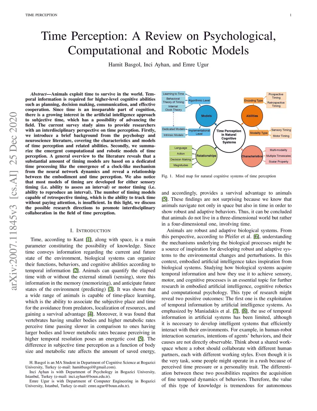 Animals exploit time to survive in the world. Temporal information is required for higher-level cognitive abilities such as planning, decision making, communication, and effective cooperation. Since time is an inseparable part of cognition, there is a growing interest in the artificial intelligence approach to subjective time, which has a possibility of advancing the field. The current survey study aims to provide researchers with an interdisciplinary perspective on time perception. Firstly, we introduce a brief background from the psychology and neuroscience literature, covering the characteristics and models of time perception and related abilities. Secondly, we summarize the emergent computational and robotic models of time perception. A general overview to the literature reveals that a substantial amount of timing models are based on a dedicated time processing like the emergence of a clock-like mechanism from the neural network dynamics and reveal a relationship between the embodiment and time perception. We also notice that most models of timing are developed for either sensory timing (i.e. ability to assess an interval) or motor timing (i.e. ability to reproduce an interval). The number of timing models capable of retrospective timing, which is the ability to track time without paying attention, is insufficient. In this light, we discuss the possible research directions to promote interdisciplinary collaboration in the field of time perception.