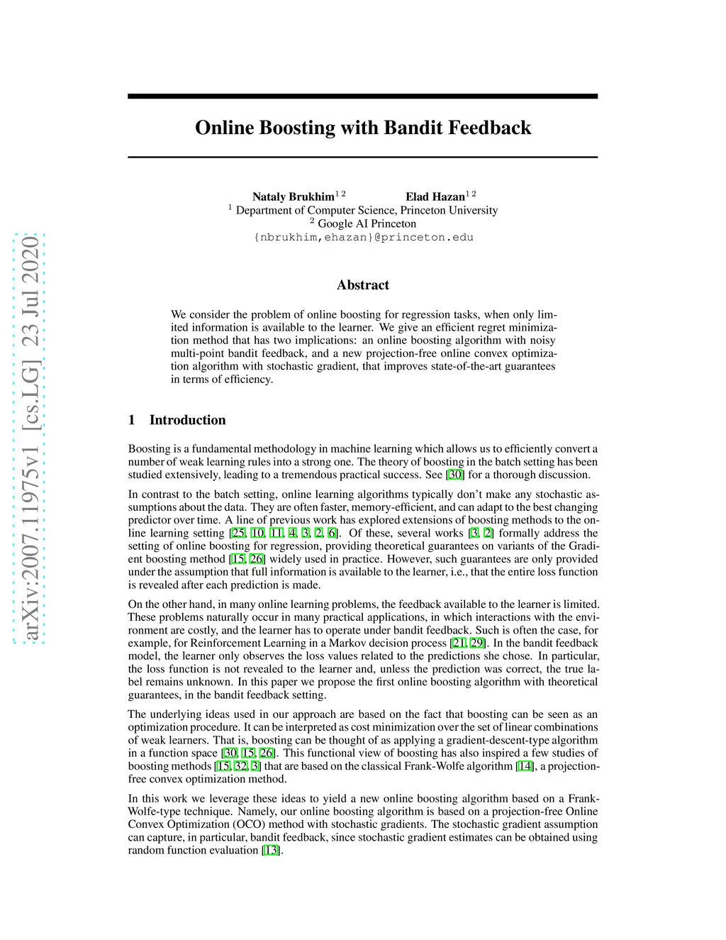 We consider the problem of online boosting for regression tasks, when only limited information is available to the learner. We give an efficient regret minimization method that has two implications: an online boosting algorithm with noisy multi-point bandit feedback, and a new projection-free online convex optimization algorithm with stochastic gradient, that improves state-of-the-art guarantees in terms of efficiency.