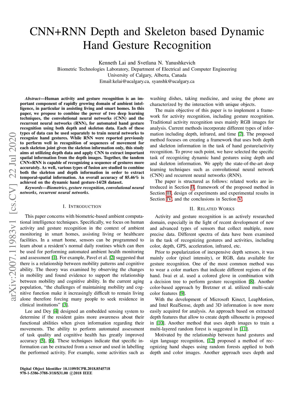 CNN+RNN Depth and Skeleton based Dynamic Hand Gesture Recognition