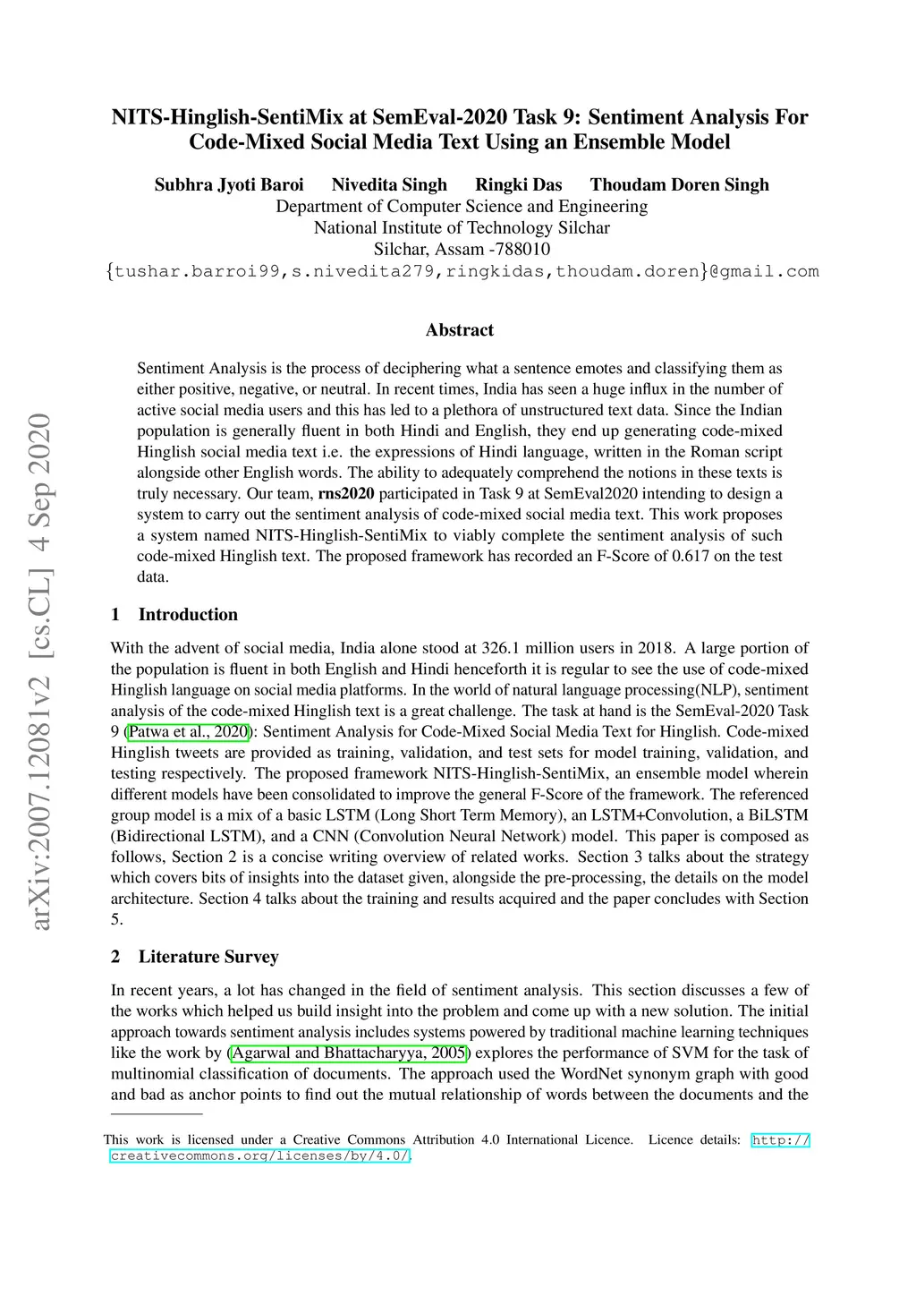 NITS-Hinglish-SentiMix at SemEval-2020 Task 9: Sentiment Analysis For