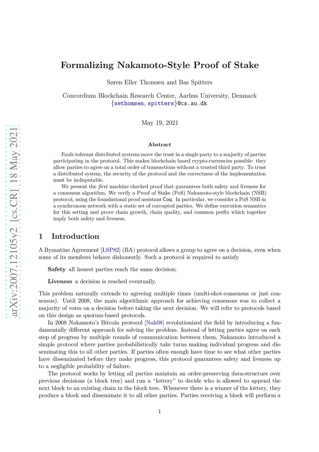 Fault-tolerant distributed systems move the trust in a single party to a majority of parties participating in the protocol. This makes blockchain based crypto-currencies possible: they allow parties to agree on a total order of transactions without a trusted third party. To trust a distributed system, the security of the protocol and the correctness of the implementation must be indisputable. We present the first machine checked proof that guarantees both safety and liveness for a consensus algorithm. We verify a Proof of Stake (PoS) Nakamoto-style blockchain (NSB) protocol, using the foundational proof assistant Coq. In particular, we consider a PoS NSB in a synchronous network with a static set of corrupted parties. We define execution semantics for this setting and prove chain growth, chain quality, and common prefix which together imply both safety and liveness.