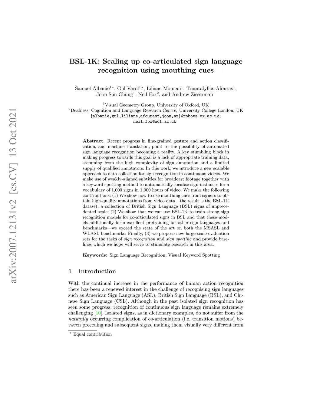 Recent progress in fine-grained gesture and action classification, and machine translation, point to the possibility of automated sign language recognition becoming a reality. A key stumbling block in making progress towards this goal is a lack of appropriate training data, stemming from the high complexity of sign annotation and a limited supply of qualified annotators. In this work, we introduce a new scalable approach to data collection for sign recognition in continuous videos. We make use of weakly-aligned subtitles for broadcast footage together with a keyword spotting method to automatically localise sign-instances for a vocabulary of 1,000 signs in 1,000 hours of video. We make the following contributions: (1) We show how to use mouthing cues from signers to obtain high-quality annotations from video data - the result is the BSL-1K dataset, a collection of British Sign Language (BSL) signs of unprecedented scale; (2) We show that we can use BSL-1K to train strong sign recognition models for co-articulated signs in BSL and that these models additionally form excellent pretraining for other sign languages and benchmarks - we exceed the state of the art on both the MSASL and WLASL benchmarks. Finally, (3) we propose new large-scale evaluation sets for the tasks of sign recognition and sign spotting and provide baselines which we hope will serve to stimulate research in this area.