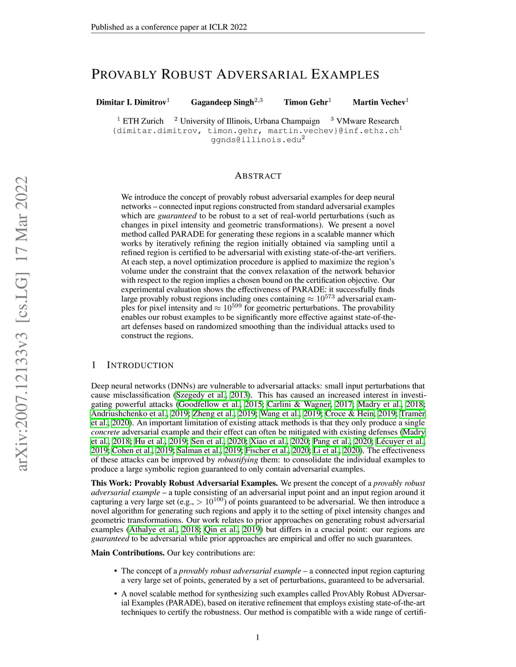 We introduce the concept of provably robust adversarial examples for deep neural networks - connected input regions constructed from standard adversarial examples which are guaranteed to be robust to a set of real-world perturbations (such as changes in pixel intensity and geometric transformations). We present a novel method called PARADE for generating these regions in a scalable manner which works by iteratively refining the region initially obtained via sampling until a refined region is certified to be adversarial with existing state-of-the-art verifiers. At each step, a novel optimization procedure is applied to maximize the region's volume under the constraint that the convex relaxation of the network behavior with respect to the region implies a chosen bound on the certification objective. Our experimental evaluation shows the effectiveness of PARADE: it successfully finds large provably robust regions including ones containing adversarial examples for pixel intensity and for geometric perturbations. The provability enables our robust examples to be significantly more effective against state-of-the-art defenses based on randomized smoothing than the individual attacks used to construct the regions.