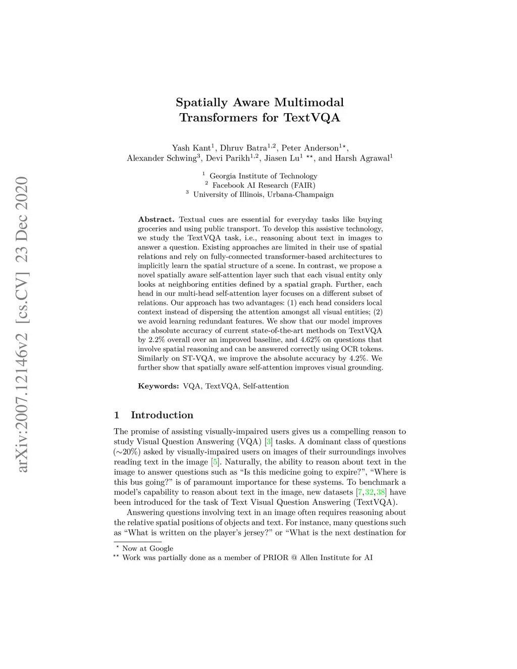 Textual cues are essential for everyday tasks like buying groceries and using public transport. To develop this assistive technology, we study the TextVQA task, i.e., reasoning about text in images to answer a question. Existing approaches are limited in their use of spatial relations and rely on fully-connected transformer-like architectures to implicitly learn the spatial structure of a scene. In contrast, we propose a novel spatially aware self-attention layer such that each visual entity only looks at neighboring entities defined by a spatial graph. Further, each head in our multi-head self-attention layer focuses on a different subset of relations. Our approach has two advantages: (1) each head considers local context instead of dispersing the attention amongst all visual entities; (2) we avoid learning redundant features. We show that our model improves the absolute accuracy of current state-of-the-art methods on TextVQA by 2.2% overall over an improved baseline, and 4.62% on questions that involve spatial reasoning and can be answered correctly using OCR tokens. Similarly on ST-VQA, we improve the absolute accuracy by 4.2%. We further show that spatially aware self-attention improves visual grounding.