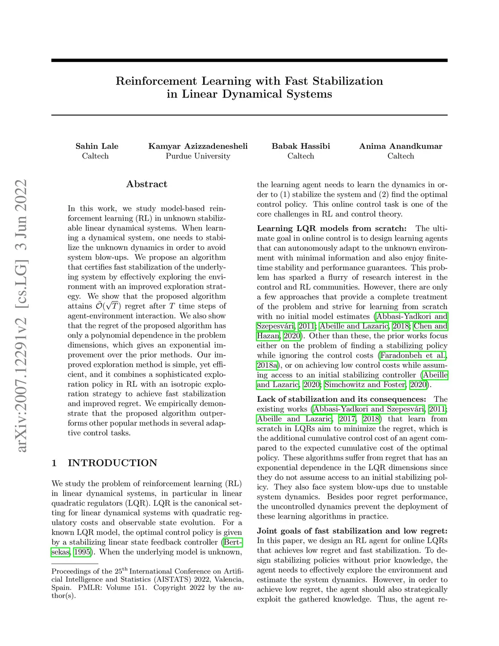 Reinforcement Learning with Fast Stabilization in Linear Dynamical