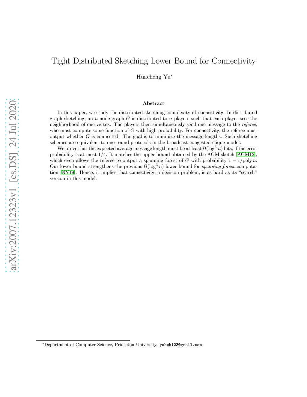 In this paper, we study the distributed sketching complexity of connectivity. In distributed graph sketching, an -node graph is distributed to players such that each player sees the neighborhood of one vertex. The players then simultaneously send one message to the referee, who must compute some function of with high probability. For connectivity, the referee must output whether is connected. The goal is to minimize the message lengths. Such sketching schemes are equivalent to one-round protocols in the broadcast congested clique model. We prove that the expected average message length must be at least bits, if the error probability is at most . It matches the upper bound obtained by the AGM sketch [AGM12], which even allows the referee to output a spanning forest of with probability . Our lower bound strengthens the previous lower bound for spanning forest computation [NY19]. Hence, it implies that connectivity, a decision problem, is as hard as its "search" version in this model.