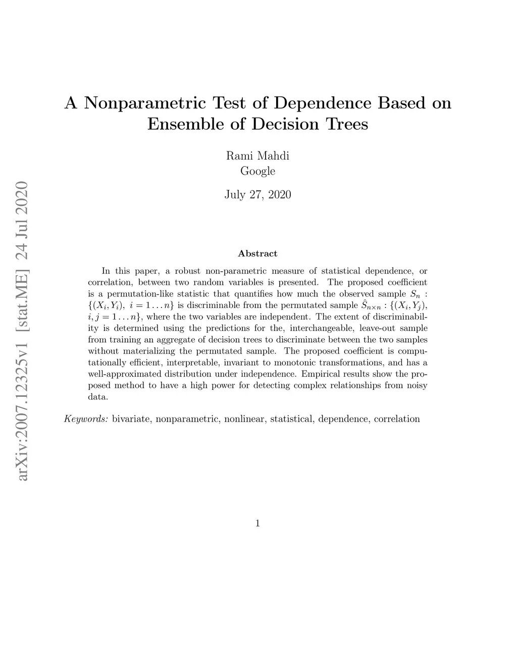 In this paper, a robust non-parametric measure of statistical dependence, or correlation, between two random variables is presented. The proposed coefficient is a permutation-like statistic that quantifies how much the observed sample S_n : {(X_i , Y_i), i = 1 . . . n} is discriminable from the permutated sample ^S_nn : {(X_i , Y_j), i, j = 1 . . . n}, where the two variables are independent. The extent of discriminability is determined using the predictions for the, interchangeable, leave-out sample from training an aggregate of decision trees to discriminate between the two samples without materializing the permutated sample. The proposed coefficient is computationally efficient, interpretable, invariant to monotonic transformations, and has a well-approximated distribution under independence. Empirical results show the proposed method to have a high power for detecting complex relationships from noisy data.