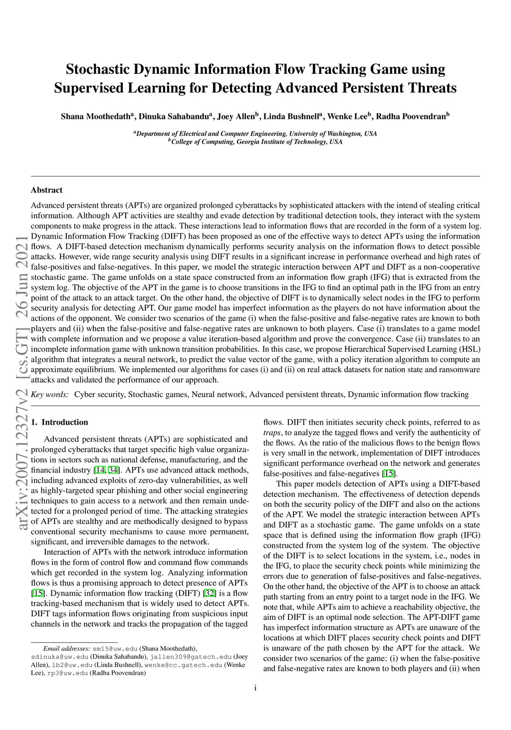 Advanced persistent threats (APTs) are organized prolonged cyberattacks by sophisticated attackers. Although APT activities are stealthy, they interact with the system components and these interactions lead to information flows. Dynamic Information Flow Tracking (DIFT) has been proposed as one of the effective ways to detect APTs using the information flows. However, wide range security analysis using DIFT results in a significant increase in performance overhead and high rates of false-positives and false-negatives generated by DIFT. In this paper, we model the strategic interaction between APT and DIFT as a non-cooperative stochastic game. The game unfolds on a state space constructed from an information flow graph (IFG) that is extracted from the system log. The objective of the APT in the game is to choose transitions in the IFG to find an optimal path in the IFG from an entry point of the attack to an attack target. On the other hand, the objective of DIFT is to dynamically select nodes in the IFG to perform security analysis for detecting APT. Our game model has imperfect information as the players do not have information about the actions of the opponent. We consider two scenarios of the game (i) when the false-positive and false-negative rates are known to both players and (ii) when the false-positive and false-negative rates are unknown to both players. Case (i) translates to a game model with complete information and we propose a value iteration-based algorithm and prove the convergence. Case (ii) translates to a game with unknown transition probabilities. In this case, we propose Hierarchical Supervised Learning (HSL) algorithm that integrates a neural network, to predict the value vector of the game, with a policy iteration algorithm to compute an approximate equilibrium. We implemented our algorithms on real attack datasets and validated the performance of our approach.