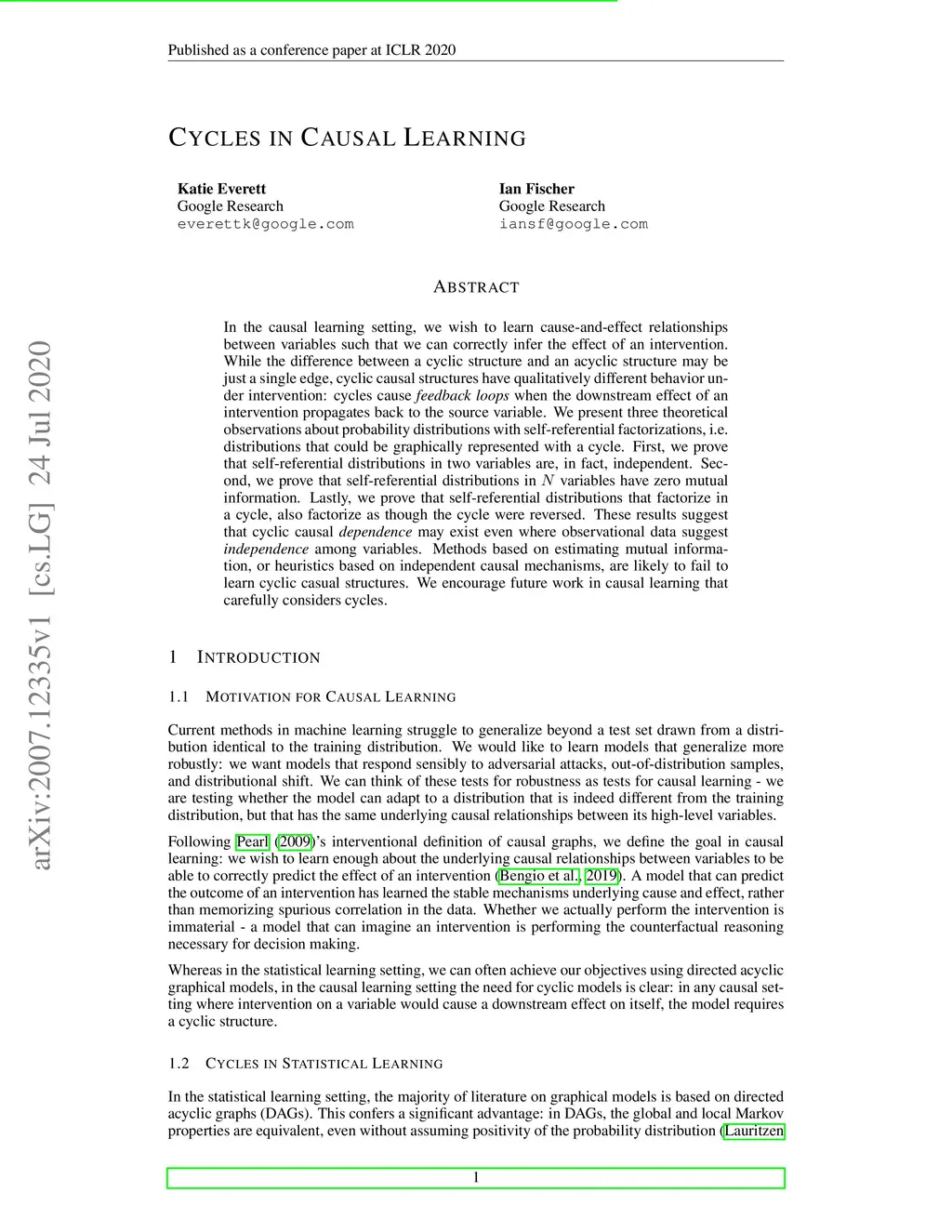 In the causal learning setting, we wish to learn cause-and-effect relationships between variables such that we can correctly infer the effect of an intervention. While the difference between a cyclic structure and an acyclic structure may be just a single edge, cyclic causal structures have qualitatively different behavior under intervention: cycles cause feedback loops when the downstream effect of an intervention propagates back to the source variable. We present three theoretical observations about probability distributions with self-referential factorizations, i.e. distributions that could be graphically represented with a cycle. First, we prove that self-referential distributions in two variables are, in fact, independent. Second, we prove that self-referential distributions in N variables have zero mutual information. Lastly, we prove that self-referential distributions that factorize in a cycle, also factorize as though the cycle were reversed. These results suggest that cyclic causal dependence may exist even where observational data suggest independence among variables. Methods based on estimating mutual information, or heuristics based on independent causal mechanisms, are likely to fail to learn cyclic casual structures. We encourage future work in causal learning that carefully considers cycles.