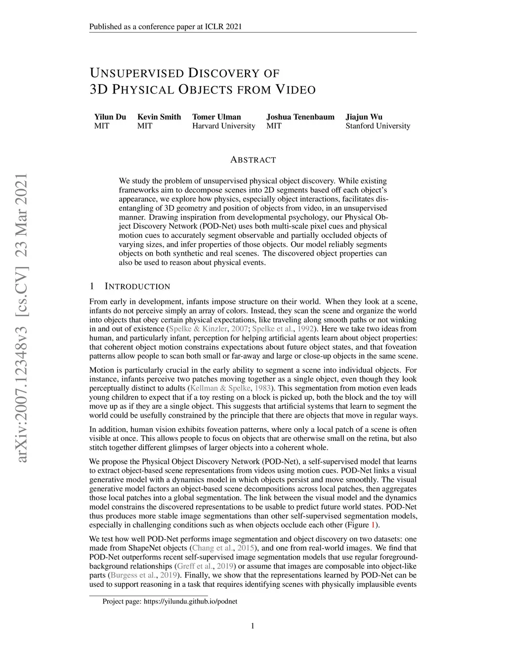 We study the problem of unsupervised physical object discovery. While existing frameworks aim to decompose scenes into 2D segments based off each object's appearance, we explore how physics, especially object interactions, facilitates disentangling of 3D geometry and position of objects from video, in an unsupervised manner. Drawing inspiration from developmental psychology, our Physical Object Discovery Network (POD-Net) uses both multi-scale pixel cues and physical motion cues to accurately segment observable and partially occluded objects of varying sizes, and infer properties of those objects. Our model reliably segments objects on both synthetic and real scenes. The discovered object properties can also be used to reason about physical events.