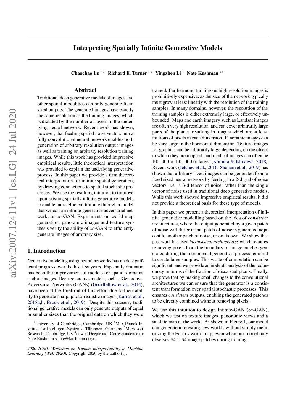 Traditional deep generative models of images and other spatial modalities can only generate fixed sized outputs. The generated images have exactly the same resolution as the training images, which is dictated by the number of layers in the underlying neural network. Recent work has shown, however, that feeding spatial noise vectors into a fully convolutional neural network enables both generation of arbitrary resolution output images as well as training on arbitrary resolution training images. While this work has provided impressive empirical results, little theoretical interpretation was provided to explain the underlying generative process. In this paper we provide a firm theoretical interpretation for infinite spatial generation, by drawing connections to spatial stochastic processes. We use the resulting intuition to improve upon existing spatially infinite generative models to enable more efficient training through a model that we call an infinite generative adversarial network, or -GAN. Experiments on world map generation, panoramic images and texture synthesis verify the ability of -GAN to efficiently generate images of arbitrary size.