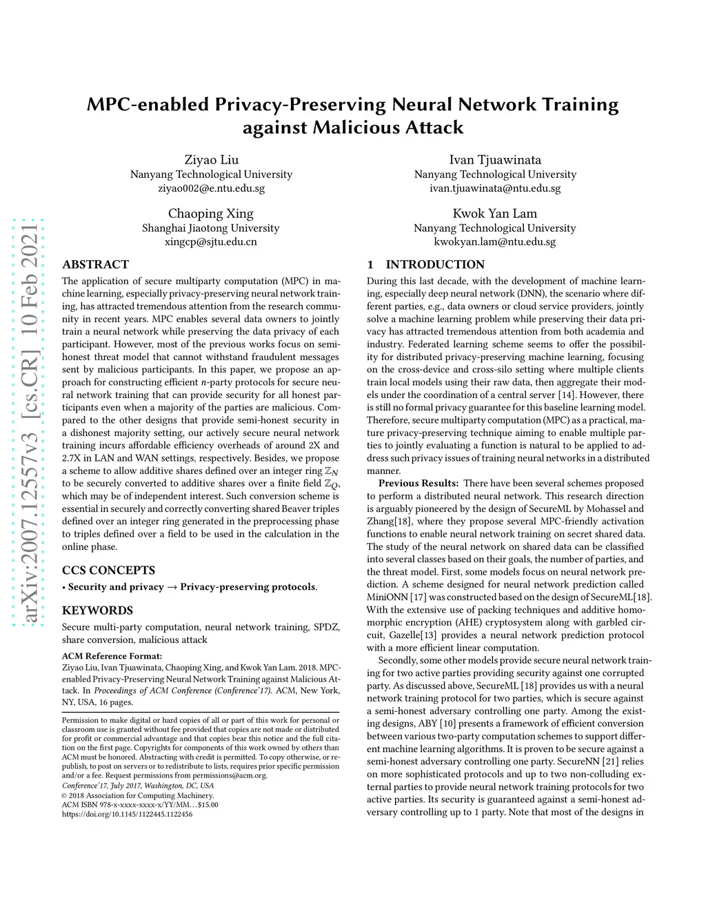 MPC-enabled Privacy-Preserving Neural Network Training against Malicious