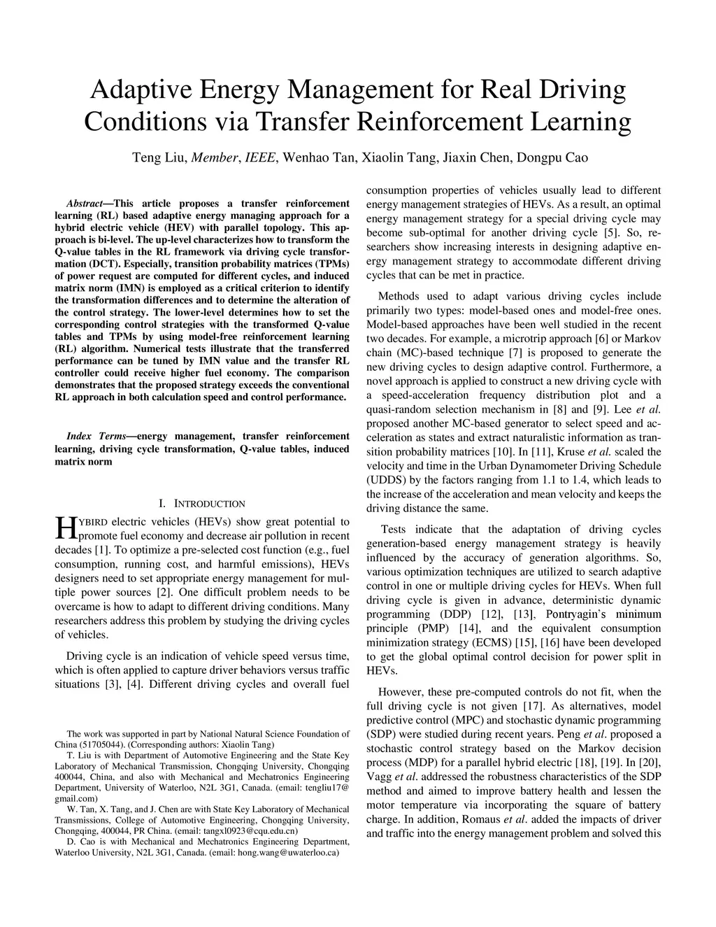 Adaptive Energy Management for Real Driving Conditions via Transfer