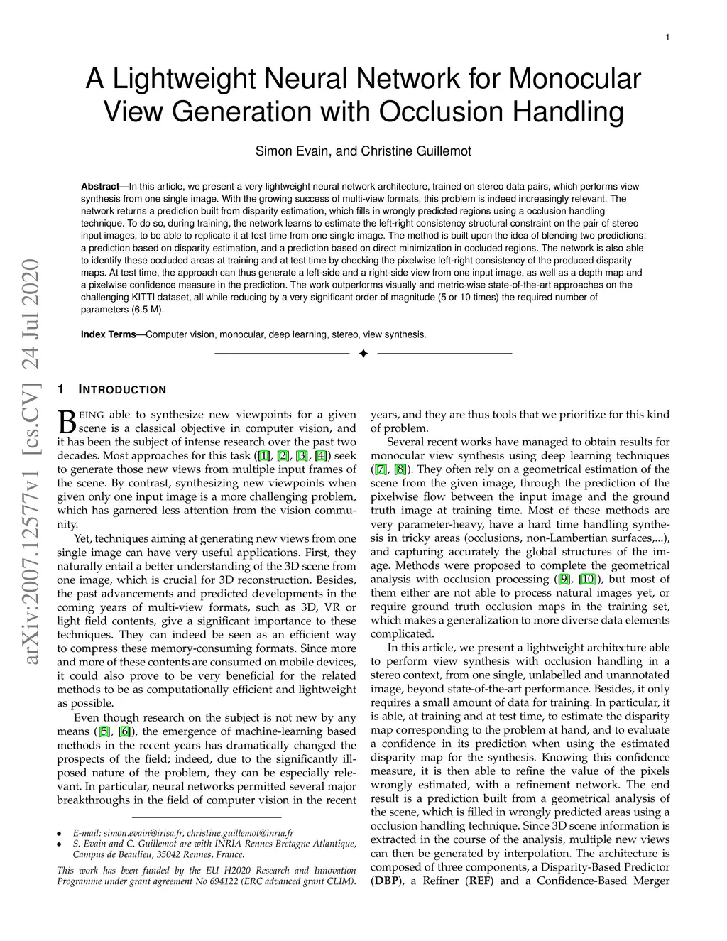 In this article, we present a very lightweight neural network architecture, trained on stereo data pairs, which performs view synthesis from one single image. With the growing success of multi-view formats, this problem is indeed increasingly relevant. The network returns a prediction built from disparity estimation, which fills in wrongly predicted regions using a occlusion handling technique. To do so, during training, the network learns to estimate the left-right consistency structural constraint on the pair of stereo input images, to be able to replicate it at test time from one single image. The method is built upon the idea of blending two predictions: a prediction based on disparity estimation, and a prediction based on direct minimization in occluded regions. The network is also able to identify these occluded areas at training and at test time by checking the pixelwise left-right consistency of the produced disparity maps. At test time, the approach can thus generate a left-side and a right-side view from one input image, as well as a depth map and a pixelwise confidence measure in the prediction. The work outperforms visually and metric-wise state-of-the-art approaches on the challenging KITTI dataset, all while reducing by a very significant order of magnitude (5 or 10 times) the required number of parameters (6.5 M).