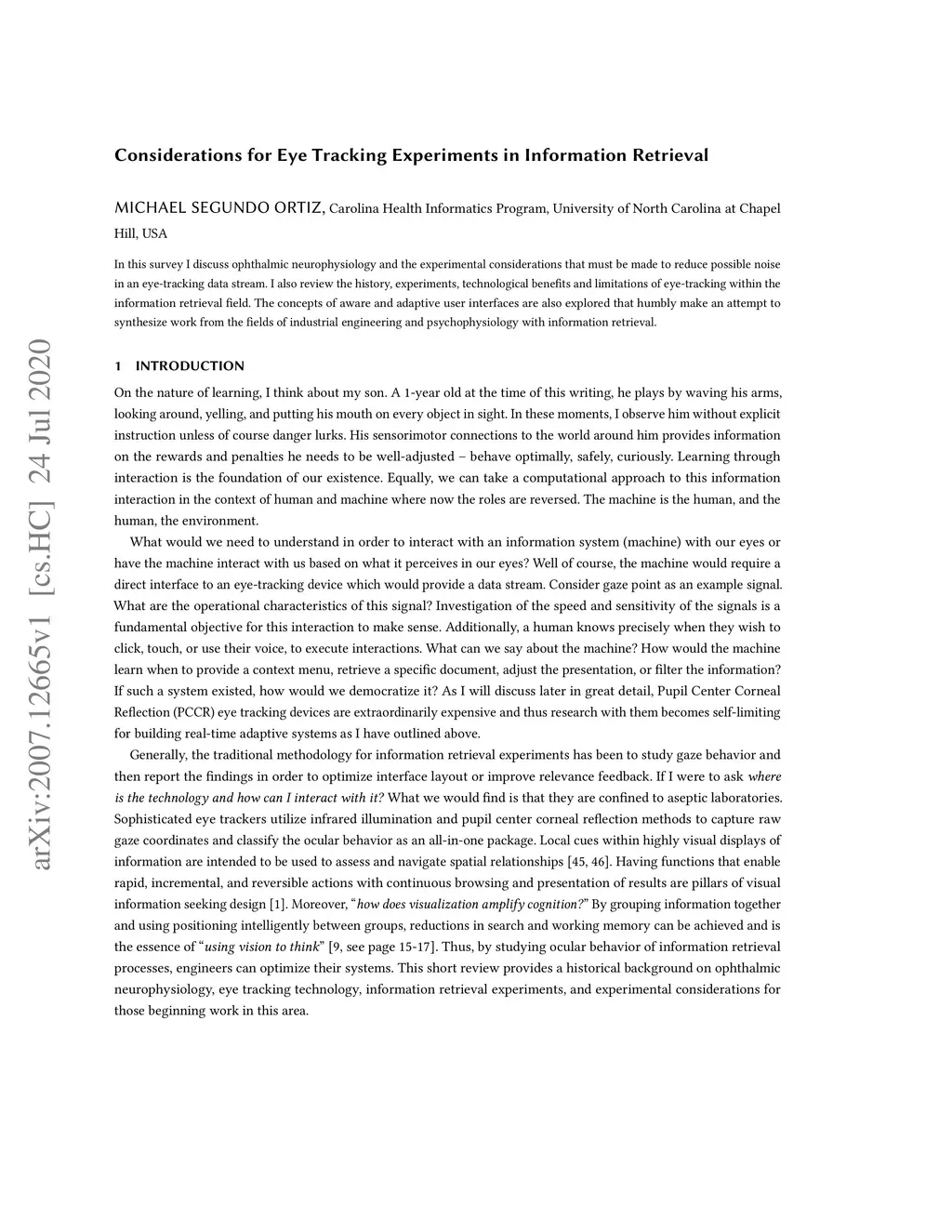 In this survey I discuss ophthalmic neurophysiology and the experimental considerations that must be made to reduce possible noise in an eye-tracking data stream. I also review the history, experiments, technological benefits and limitations of eye-tracking within the information retrieval field. The concepts of aware and adaptive user interfaces are also explored that humbly make an attempt to synthesize work from the fields of industrial engineering and psychophysiology with information retrieval.