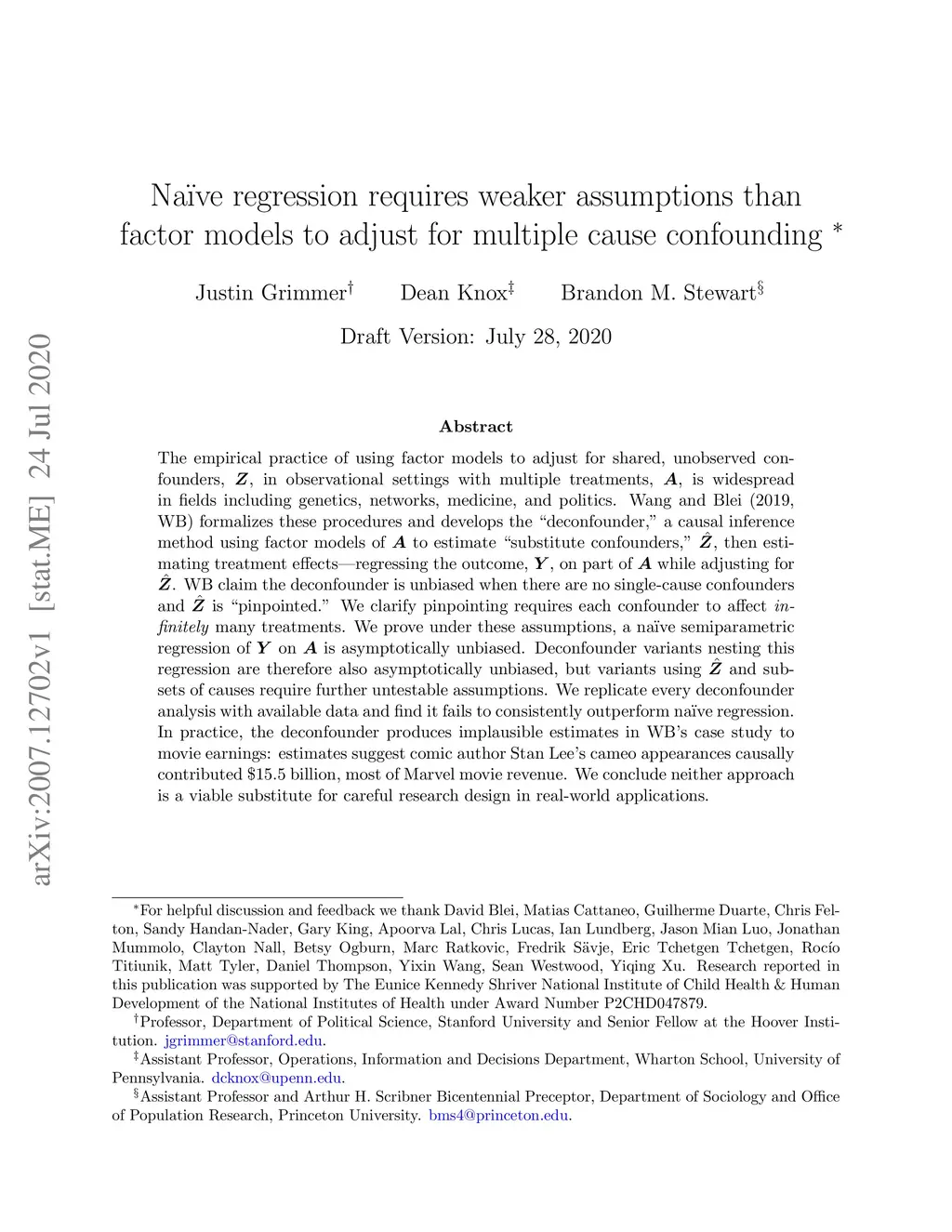 The empirical practice of using factor models to adjust for shared, unobserved confounders, , in observational settings with multiple treatments, , is widespread in fields including genetics, networks, medicine, and politics. Wang and Blei (2019, WB) formalizes these procedures and develops the "deconfounder," a causal inference method using factor models of to estimate "substitute confounders," , then estimating treatment effects by regressing the outcome, , on part of while adjusting for . WB claim the deconfounder is unbiased when there are no single-cause confounders and is "pinpointed." We clarify pinpointing requires each confounder to affect infinitely many treatments. We prove under these assumptions, a na\"ive semiparametric regression of on is asymptotically unbiased. Deconfounder variants nesting this regression are therefore also asymptotically unbiased, but variants using and subsets of causes require further untestable assumptions. We replicate every deconfounder analysis with available data and find it fails to consistently outperform na\"ive regression. In practice, the deconfounder produces implausible estimates in WB's case study to movie earnings: estimates suggest comic author Stan Lee's cameo appearances causally contributed \$15.5 billion, most of Marvel movie revenue. We conclude neither approach is a viable substitute for careful research design in real-world applications.