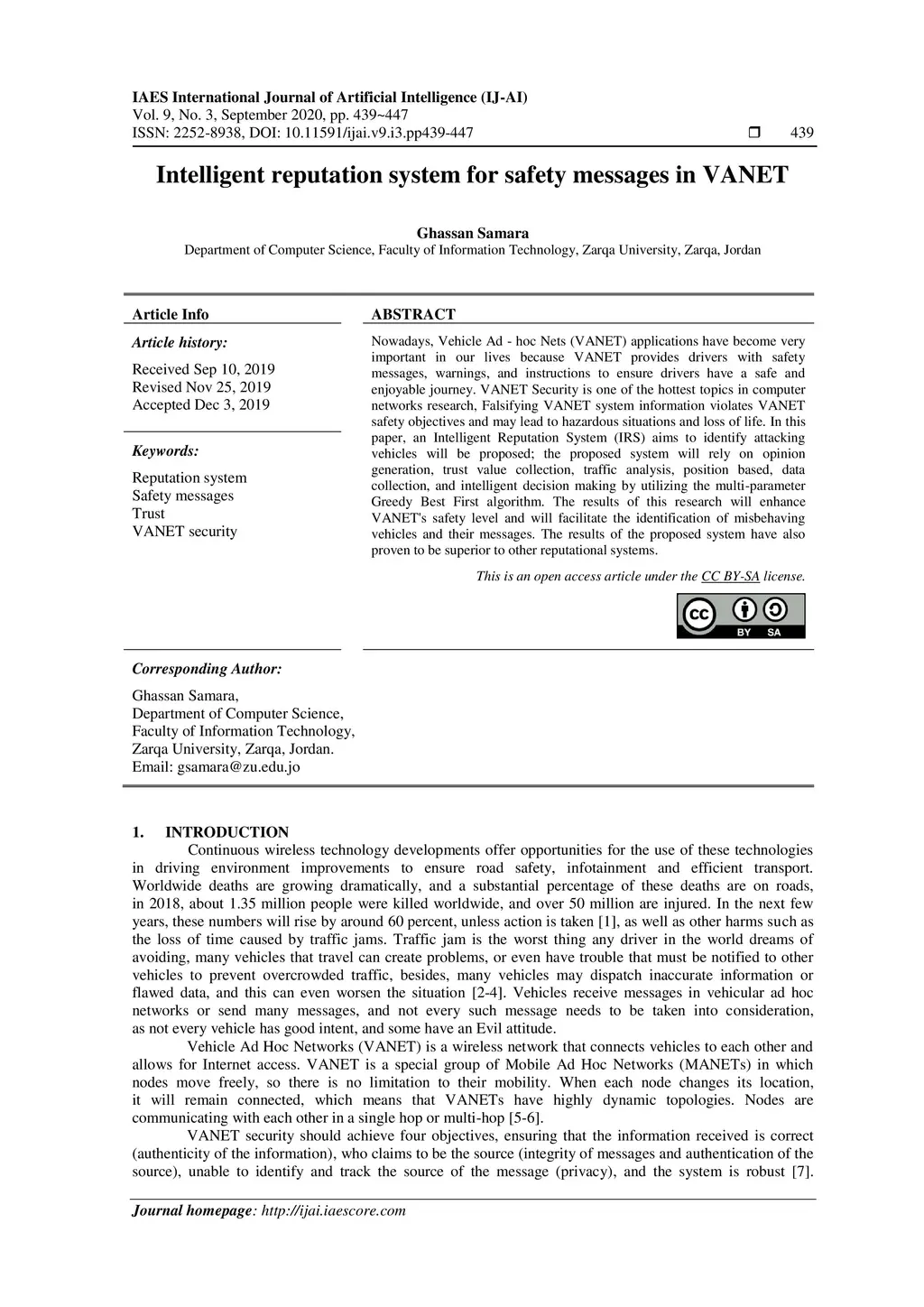 Intelligent Reputation System for Safety Messages in VANET
